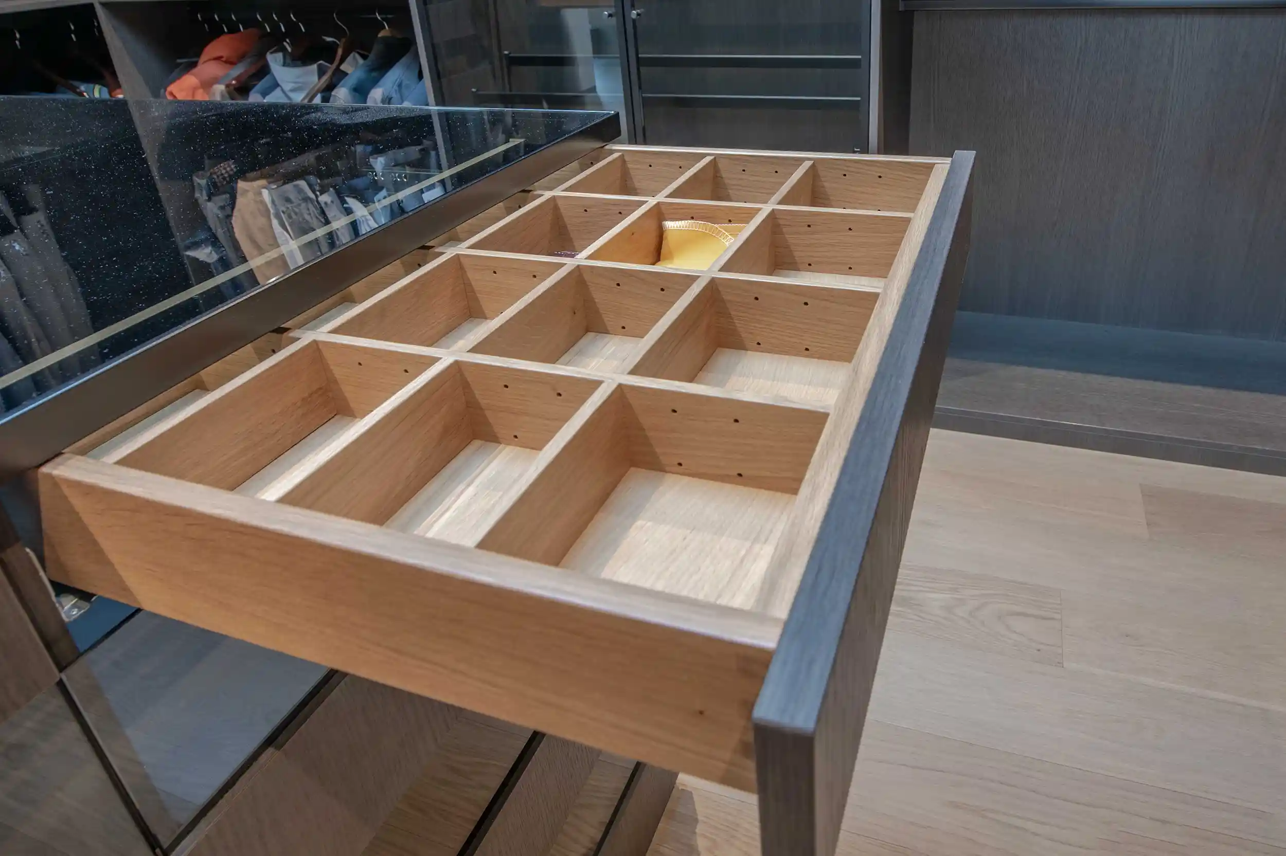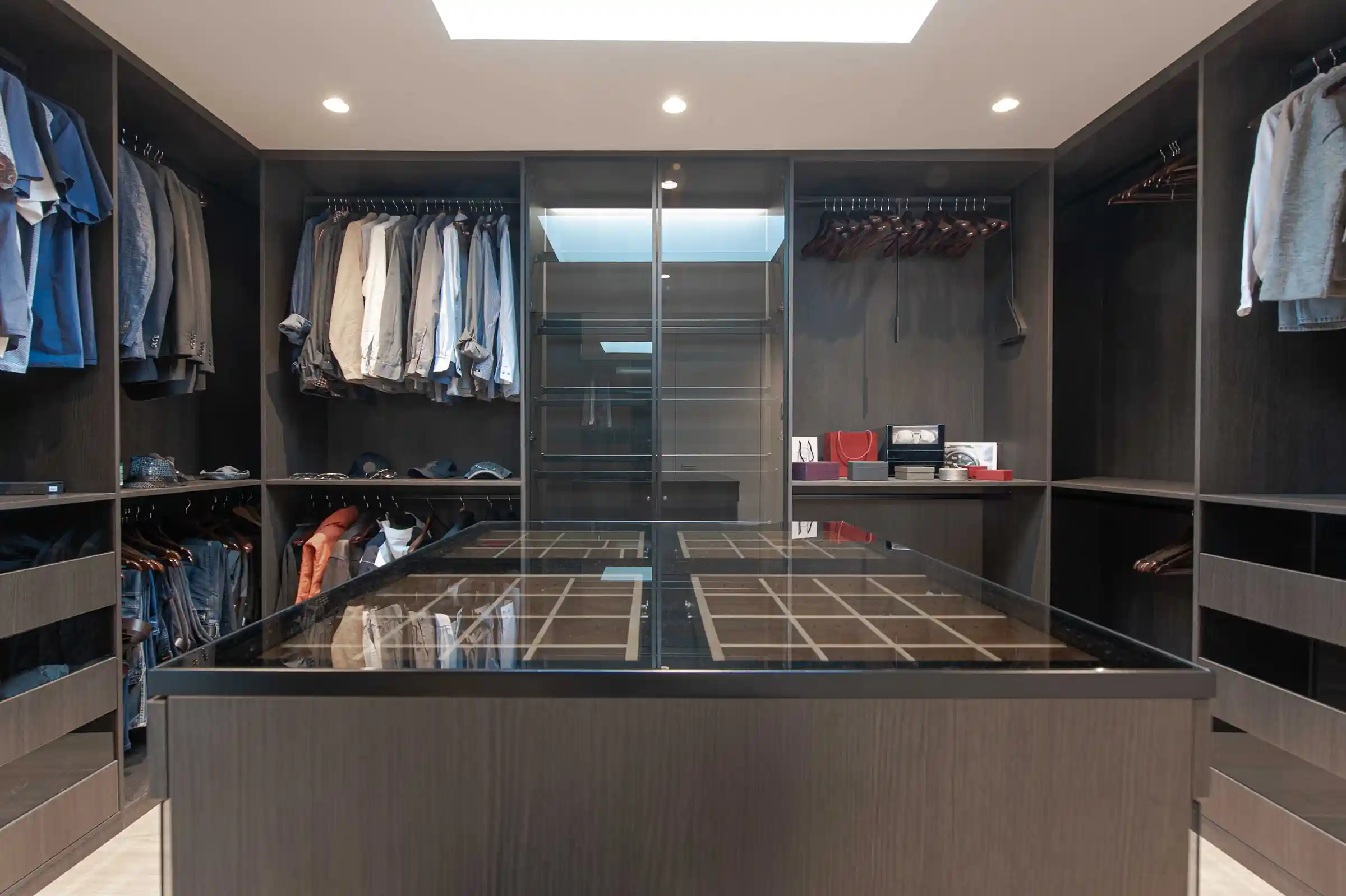Transparenz und Struktur Ein besonderes Highlight dieser Ankleide sind die Schubladenfronten. Diese bestehen aus getöntem Sicherheitsglas. Dieser Kniff sorgt dafür, dass der offene Charakter des Raumes erhalten bleibt und die Struktur der Inhalte – etwa feine Strickwaren oder Accessoires – schemenhaft erkennbar ist, ohne unruhig zu wirken. Auch der „Inselschrank“ in der Raummitte folgt diesem Konzept: Seine Abdeckung aus getöntem Glas gewährt einen Blick in die oberste Schublade, die oft für Uhren, Schmuck oder Krawatten genutzt wird.