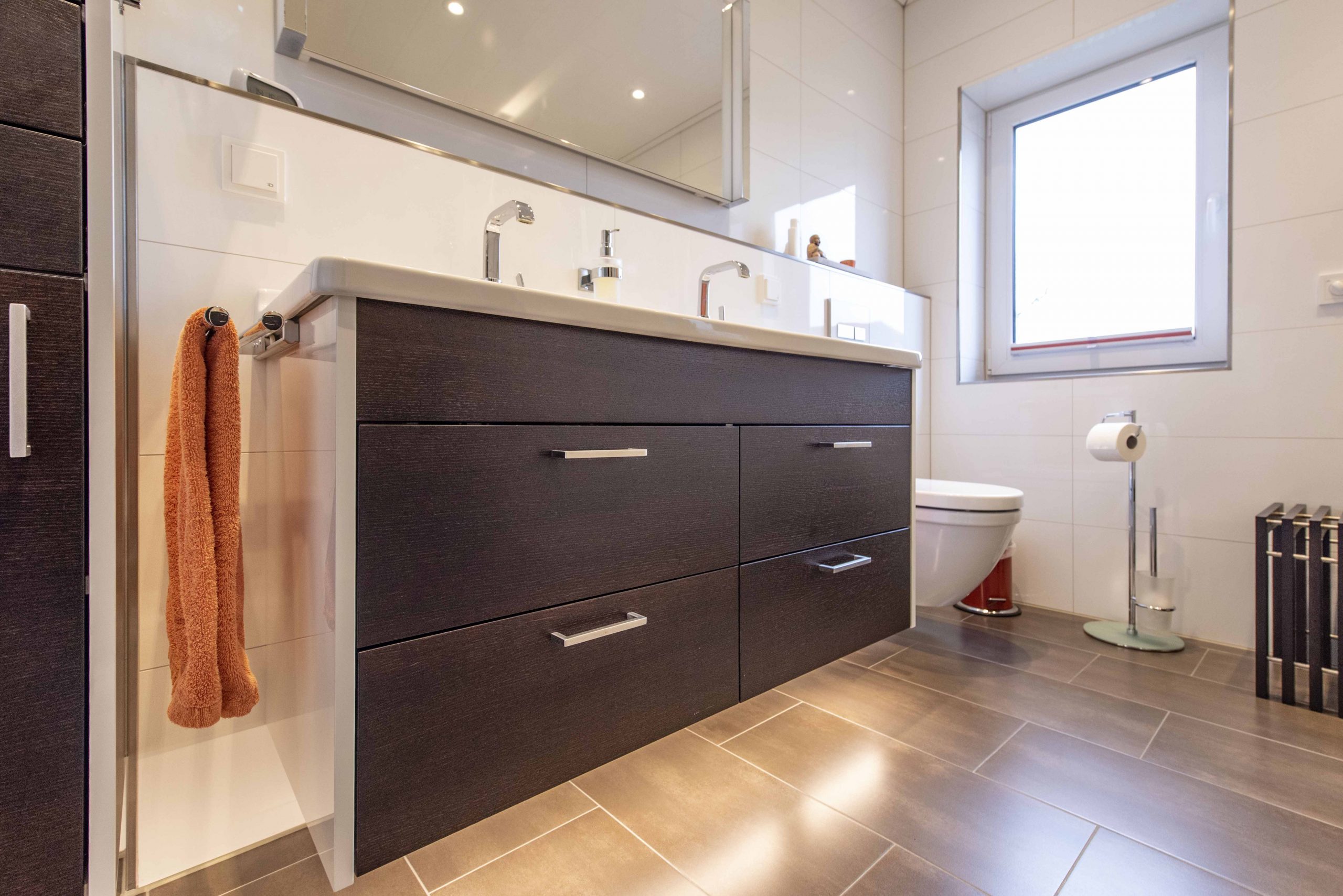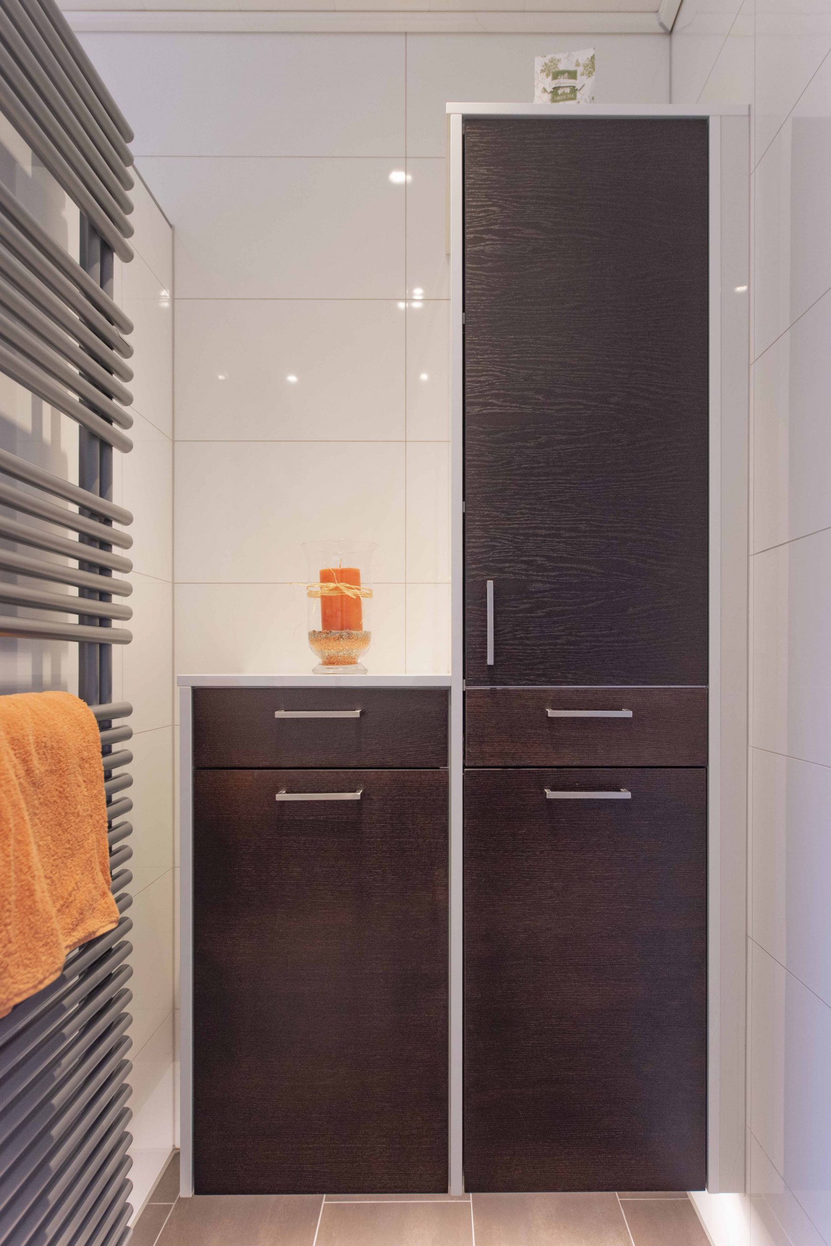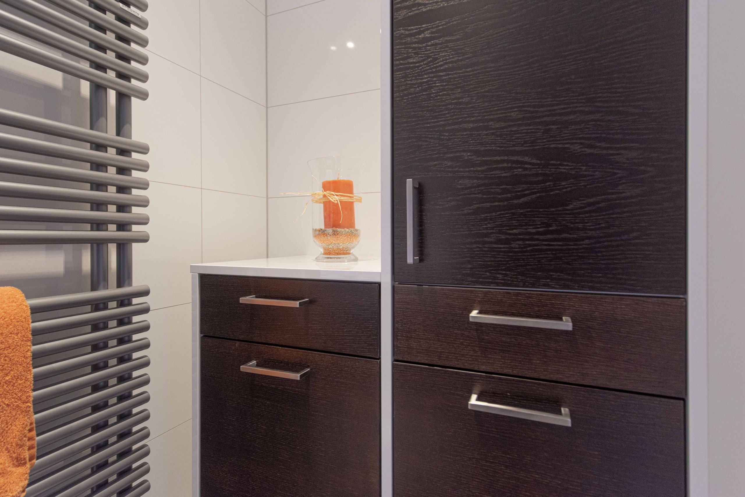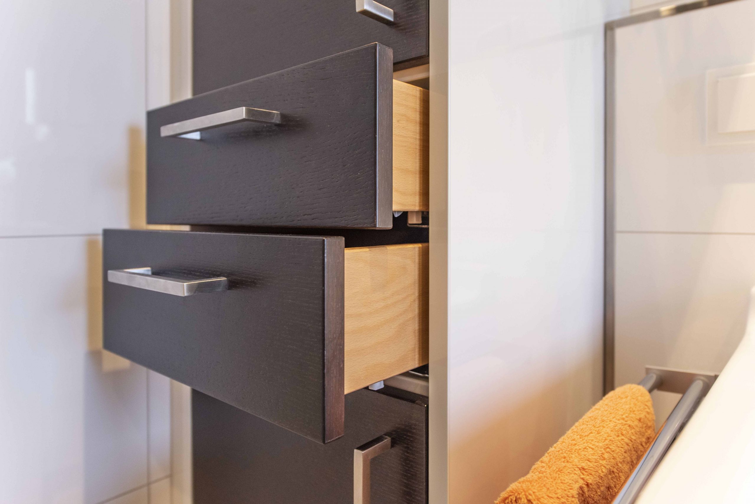 Die Anforderungen an Badmöbel sind hoch: Sie sollen sich harmonisch in die Gestaltung des Badezimmers einfügen und zugleich viel Stauraum für Pflegeprodukte und Textilien bieten. Bei diesem Badmöbel wurde zudem eine dunkle Front gewünscht, die sich von den weißen Fliesen abhebt.