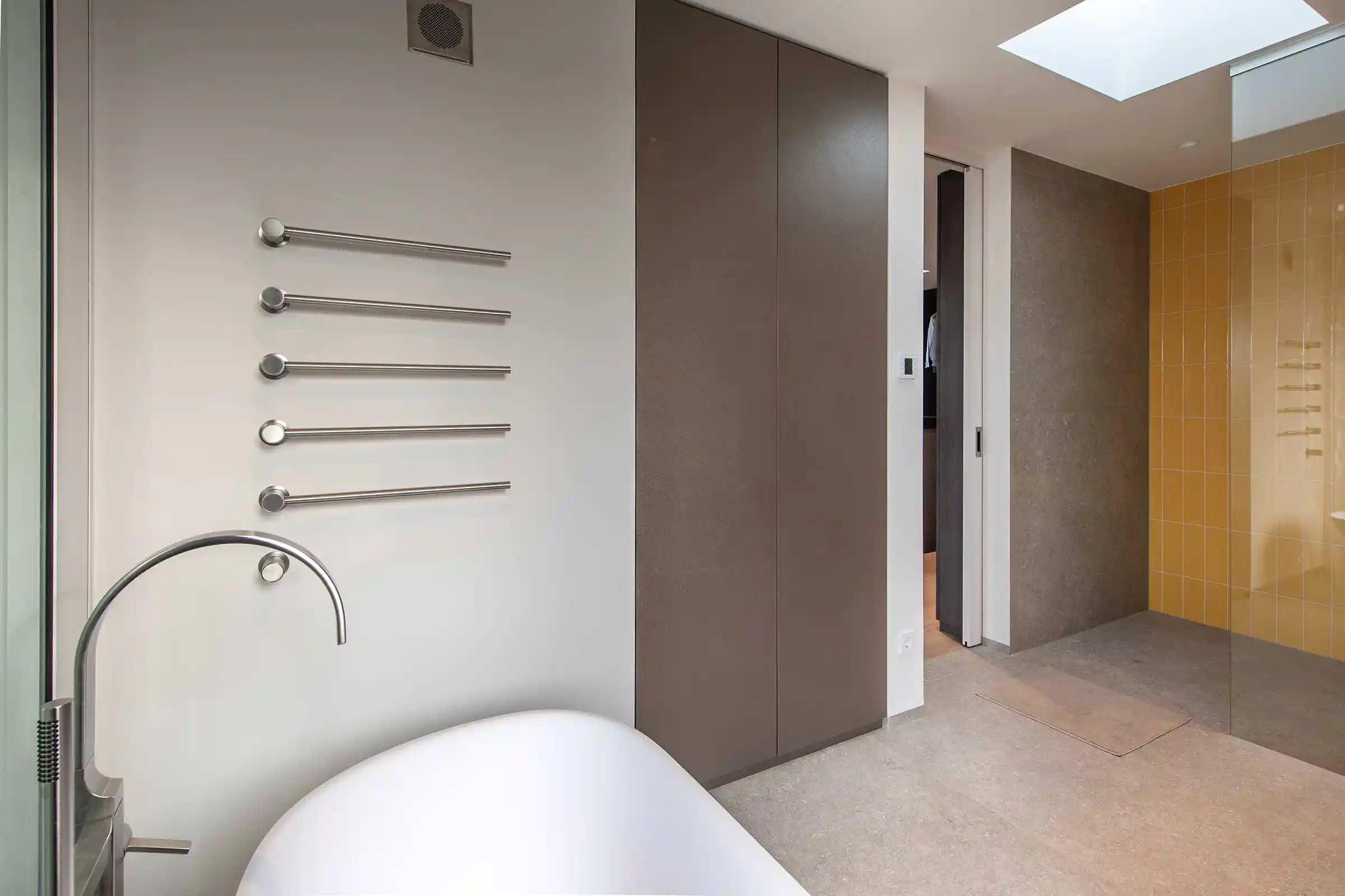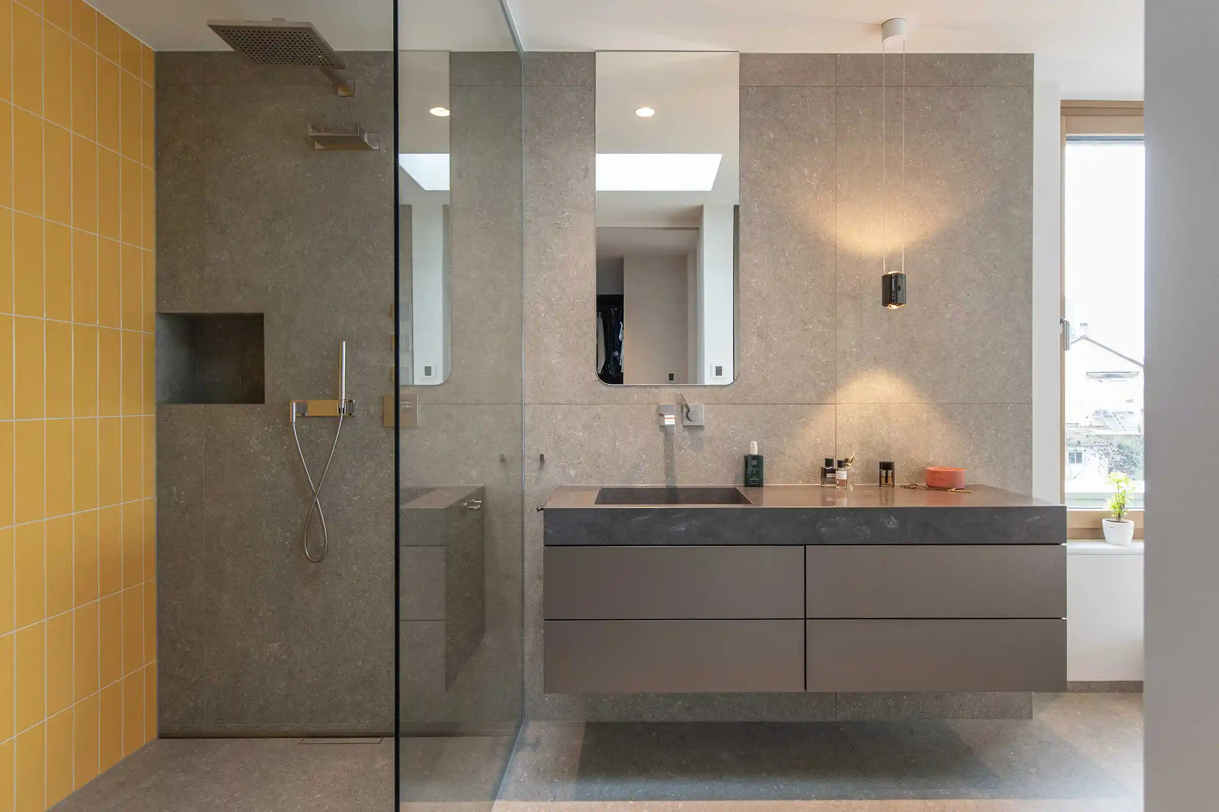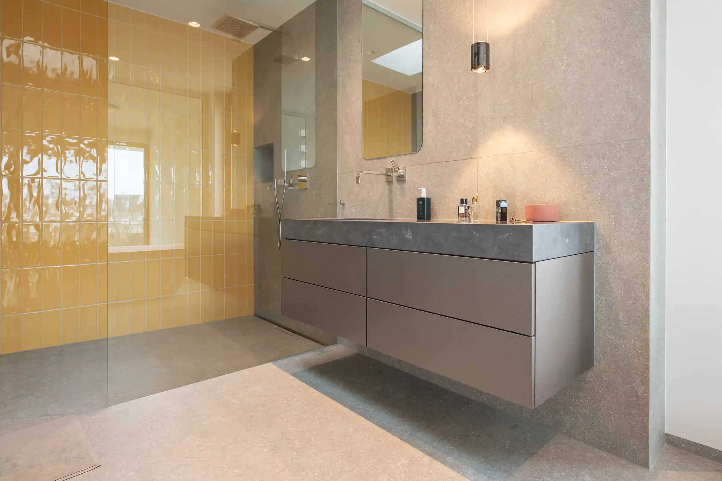 In Kombination mit den hellgrauen Bodenfliesen und den mutigen Akzenten im Duschbereich – wie den gelben Fliesen unter der Wasserfalldusche – entsteht ein spannungsreiches Gesamtbild. Unsere Möbel fungieren hier als ruhiger, aber präsenter Ankerpunkt im Design.