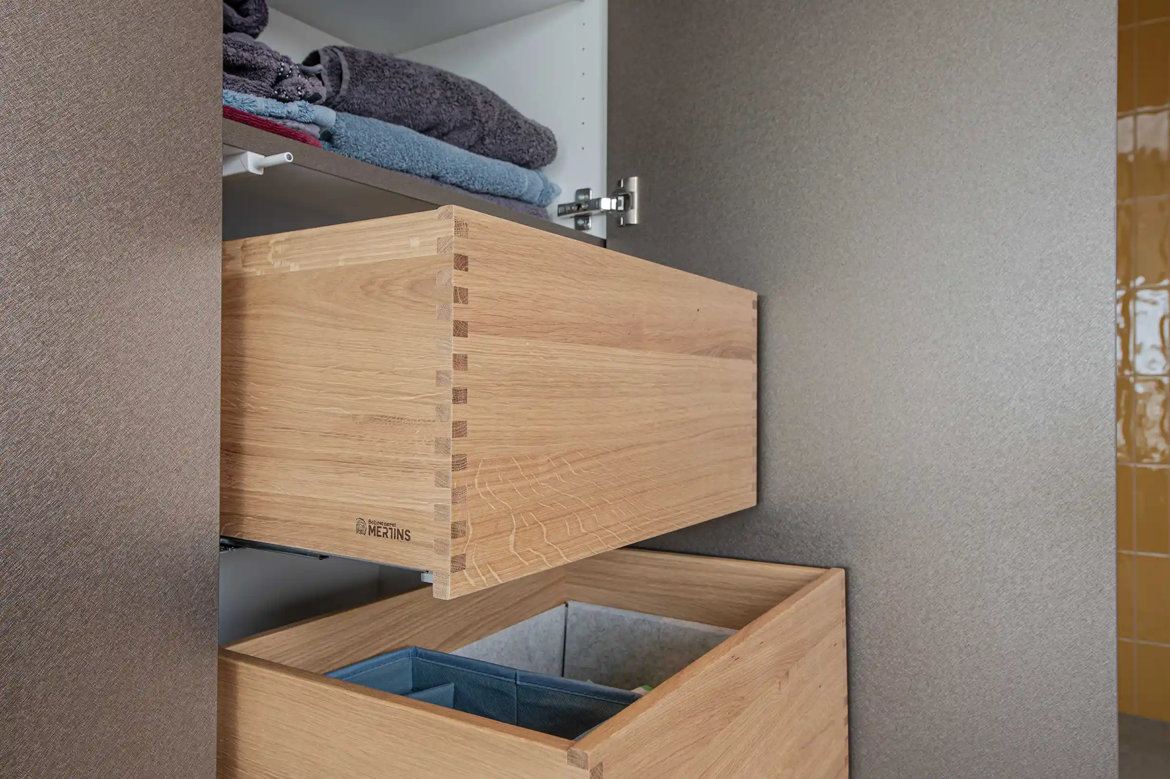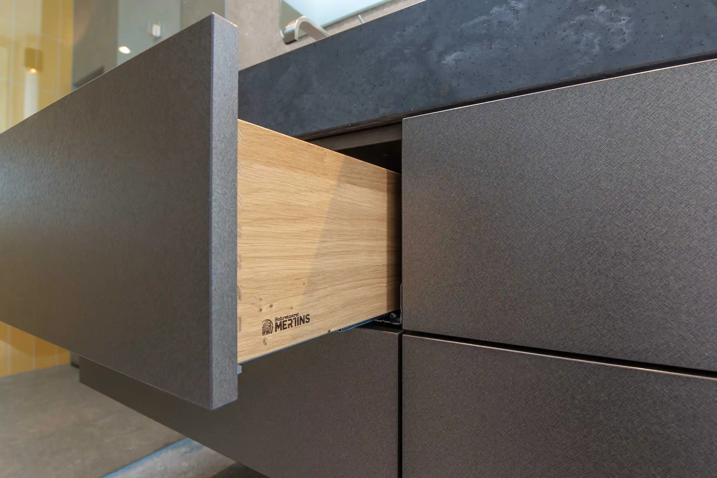 Das wahre Highlight offenbart sich beim Öffnen der Möbel: Die Innenausstattung besteht aus massiver Buche. Wir haben uns bewusst gegen Standardlösungen entschieden und die Schubläden klassisch gezinkt. Diese traditionelle Eckverbindung ist nicht nur ein Zeichen höchster Schreinerkunst und enormer Stabilität, sondern bildet auch einen warmen, organischen Kontrast zur Metallic-Optik der Außenhülle. Das helle, feinporige Buchenholz verströmt eine Natürlichkeit, die jedes Mal Freude bereitet, wenn man nach einem Handtuch greift.