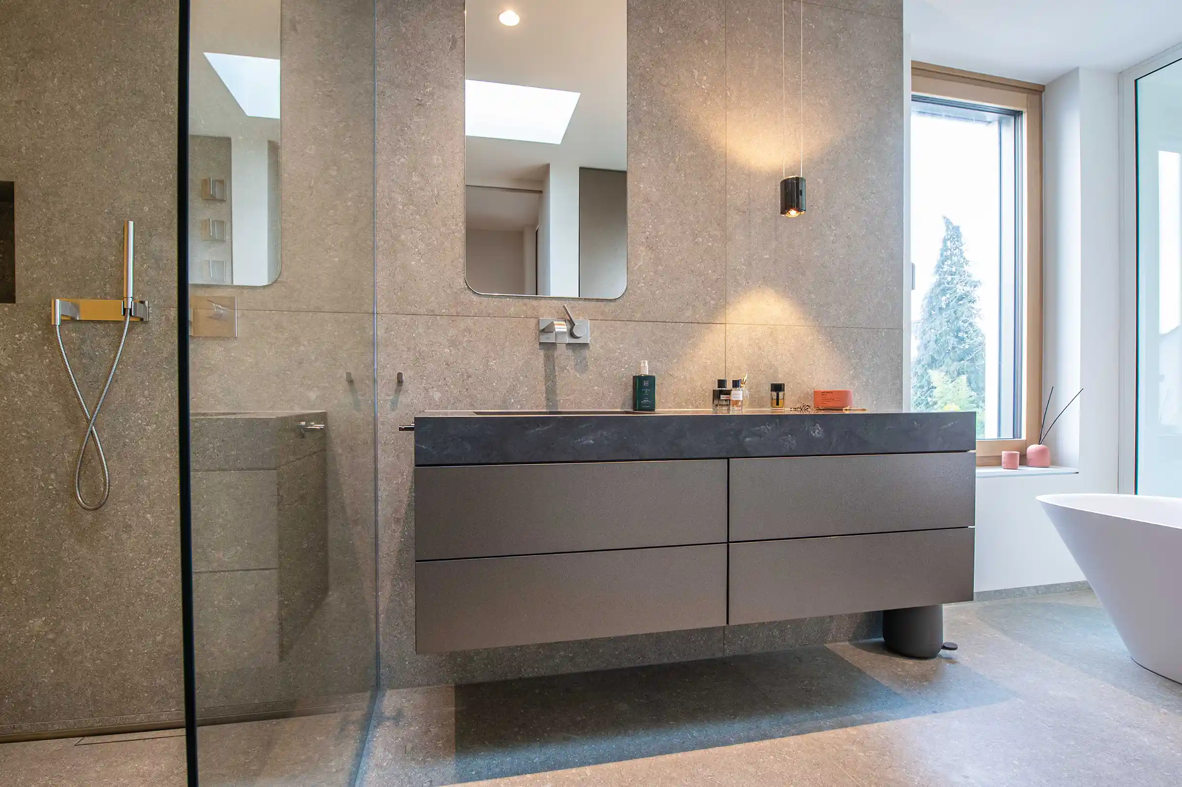 Die Herausforderung bei diesem Projekt war die Gestaltung eines Bades, das durch große Fensterflächen und viel natürliches Licht besticht. Um dieses Spiel mit dem Licht aufzugreifen, haben wir uns für eine außergewöhnliche Oberflächengestaltung entschieden.
