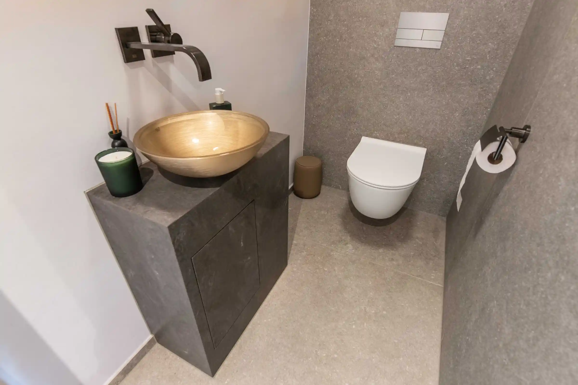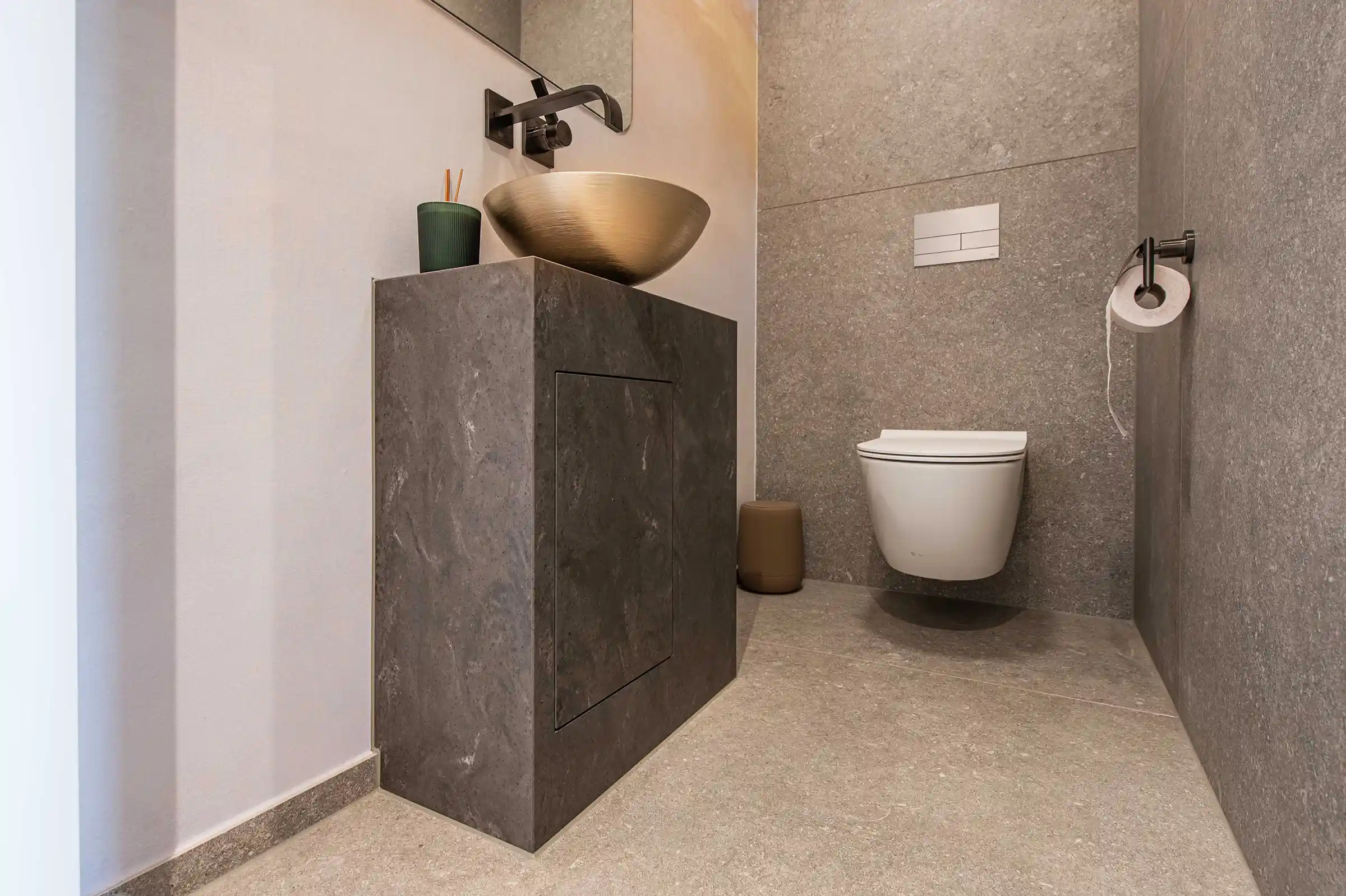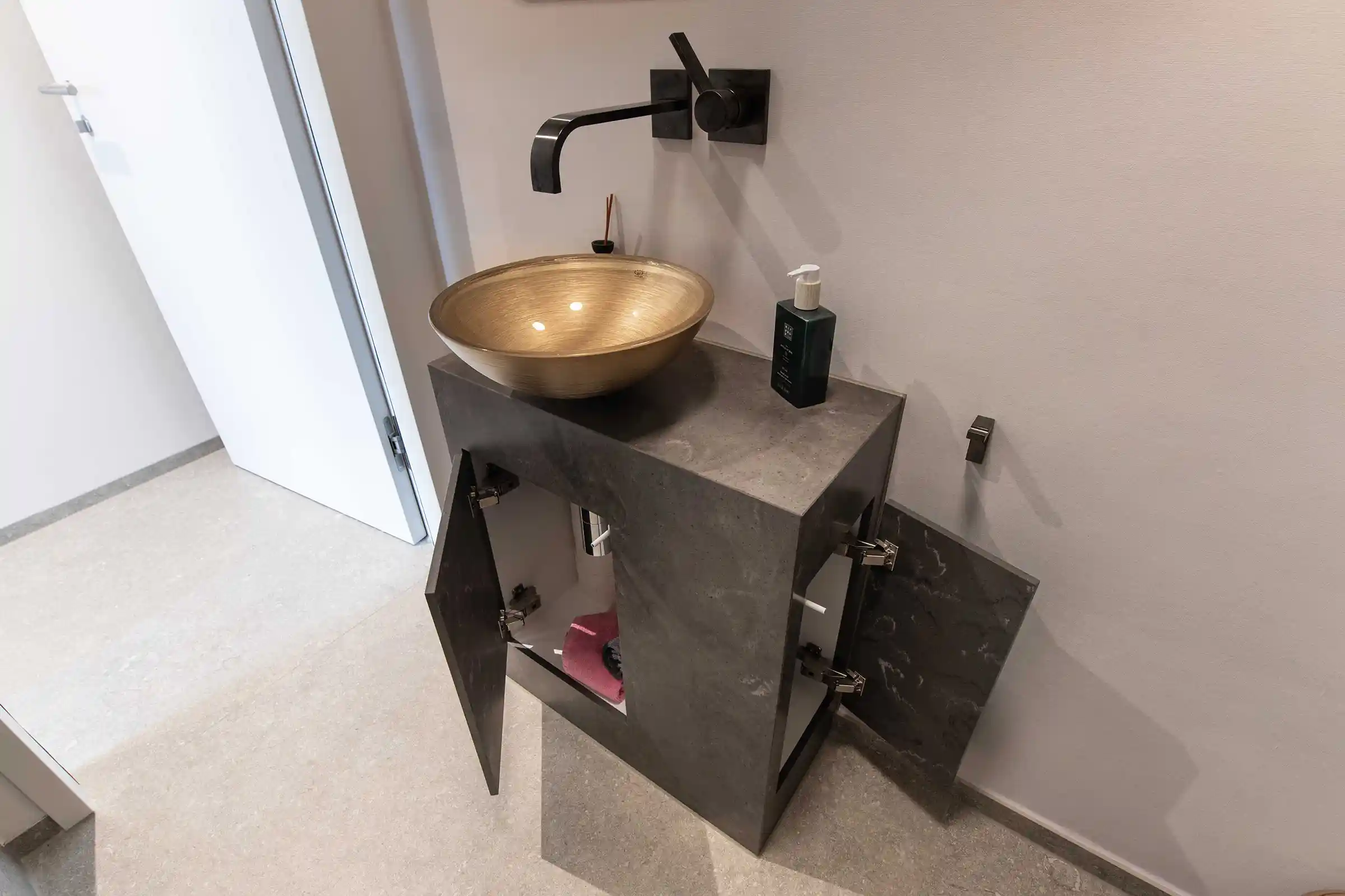 Auch im Gäste-WC haben wir die Designlinie konsequent fortgeführt. Ein kompakter Unterschrank mit zwei Fächern beweist, dass kluge Planung auch in kleinen Räumen keine Kompromisse erfordert. Während das vordere Fach den täglichen Bedarf abdeckt, ermöglicht ein seitlich integriertes Fach den diskreten Zugriff auf Reinigungsmittel – unsichtbar für den Gast, aber jederzeit griffbereit.