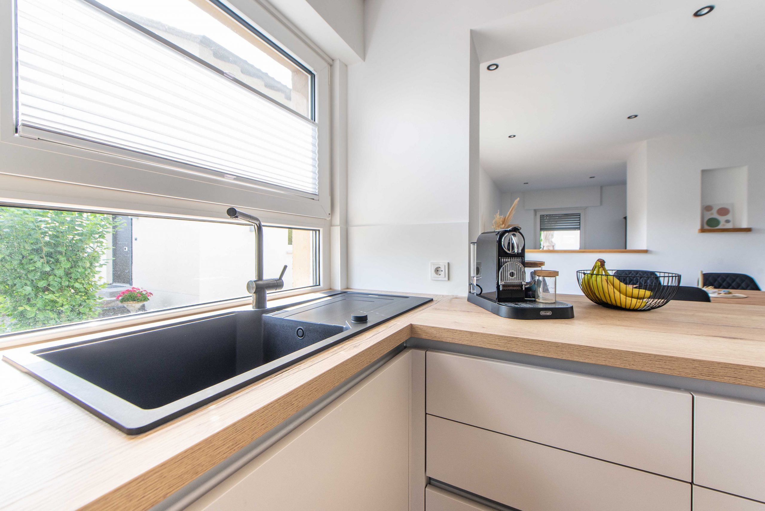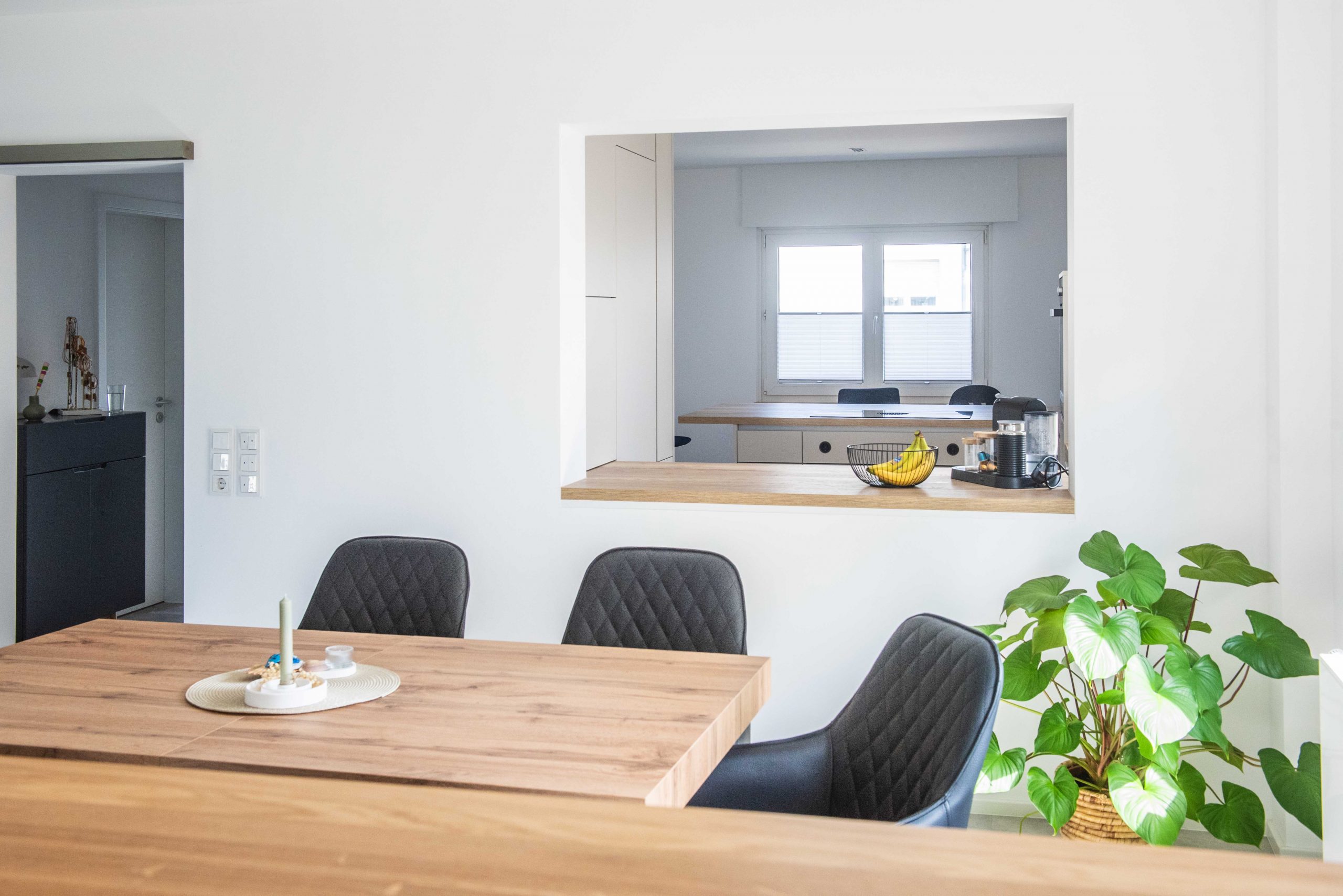Im Ganzen ergibt sich somit ein Wohn-, Ess- und Küchenraum, der fließende Übergänge aufweist. Als „Nebeneffekt“ sind einzigartige Sichtachsen entstanden und das gesamte Erdgeschoss wurde in ein offenes und helles zu Hause verwandelt.