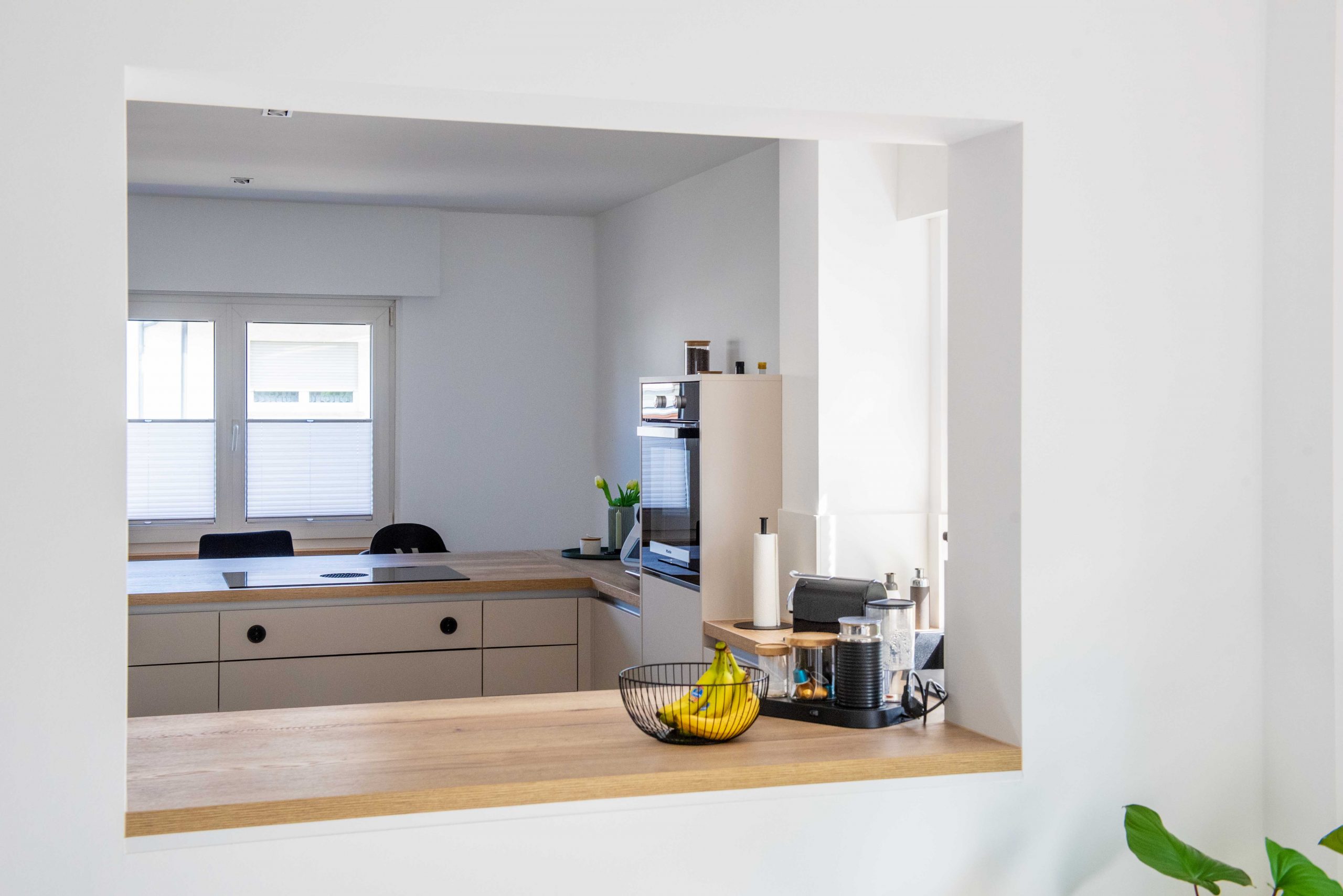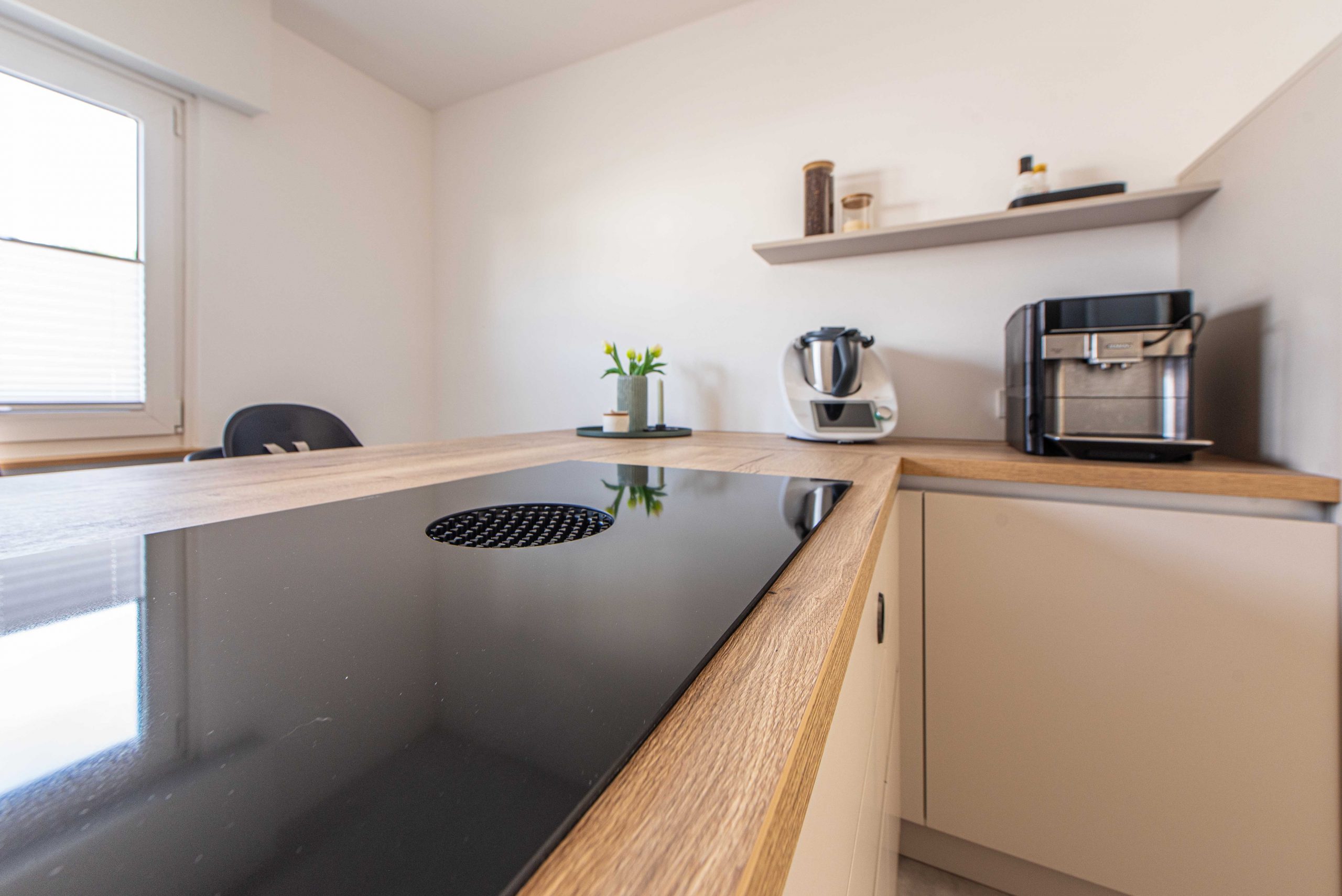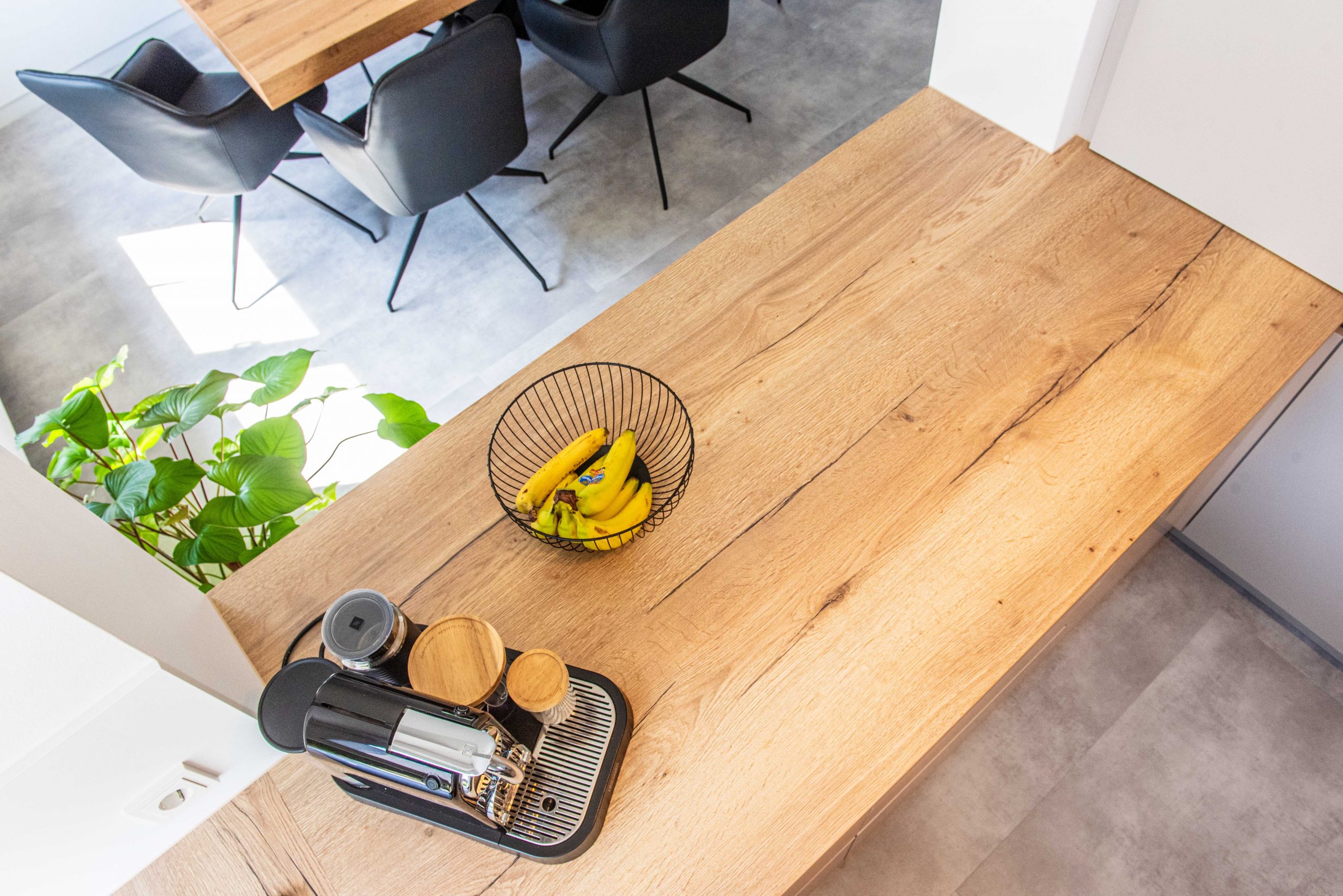 Ganz bewusst wurde auf Hängeschränke verzichtet. Das typische „Küchenflair“ fehlt diesem Raum komplett. An einem großen „Tisch“ mit Unterschränken finden sich Sitzgelegenheiten und die Kochplatte. Dank des BORA Kochfeldes konnte auf eine Dunstabzugshaube verzichtet werden. Geschirrspüler und Backofen bilden einen niedrigen „Hochschrank“. Gegenüber befinden sich zwei Hochschränke mit Kühl- und Gefrierschrank sowie einem Vorratsschrank. Der alte, kleine Küchenraum wurde zum Wohnraum aufgebrochen – jedoch nicht mit einem Durchgang, sondern einer großen Öffnung. In diese Öffnung hinein hat eine weitere Ablage- und Arbeitsfläche, sowie Unterschränke ihren Platz gefunden.