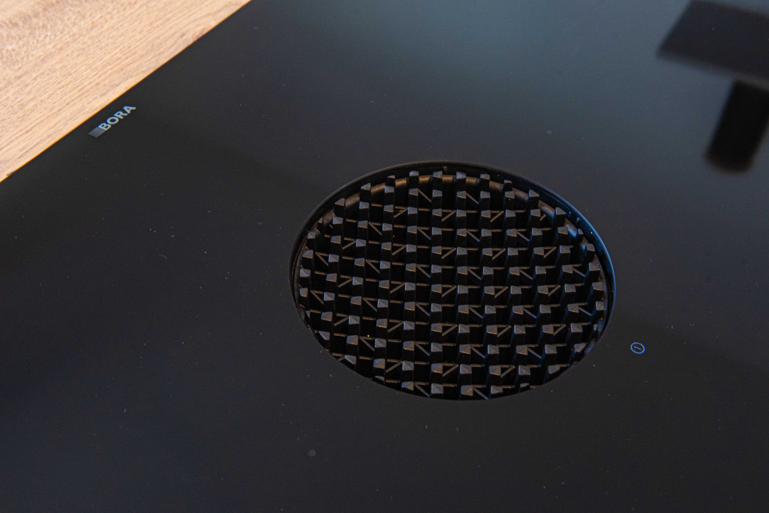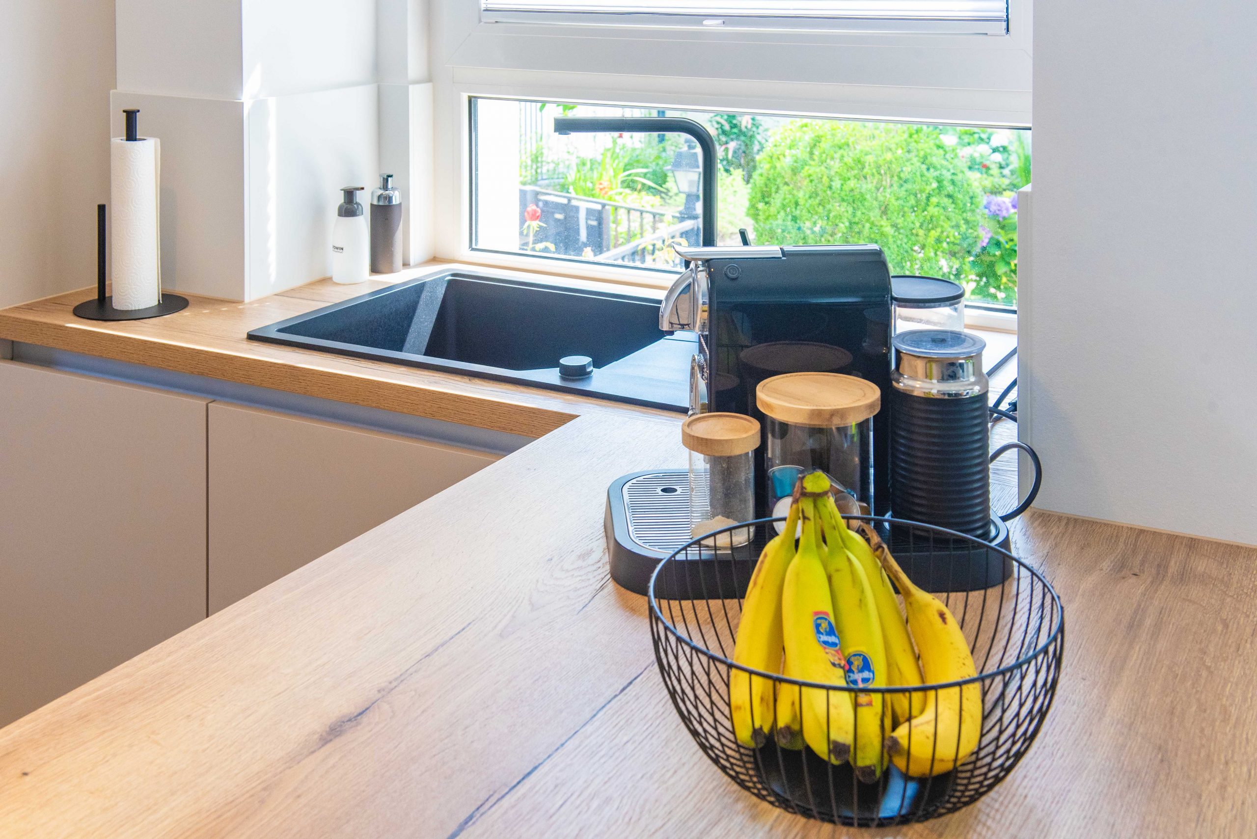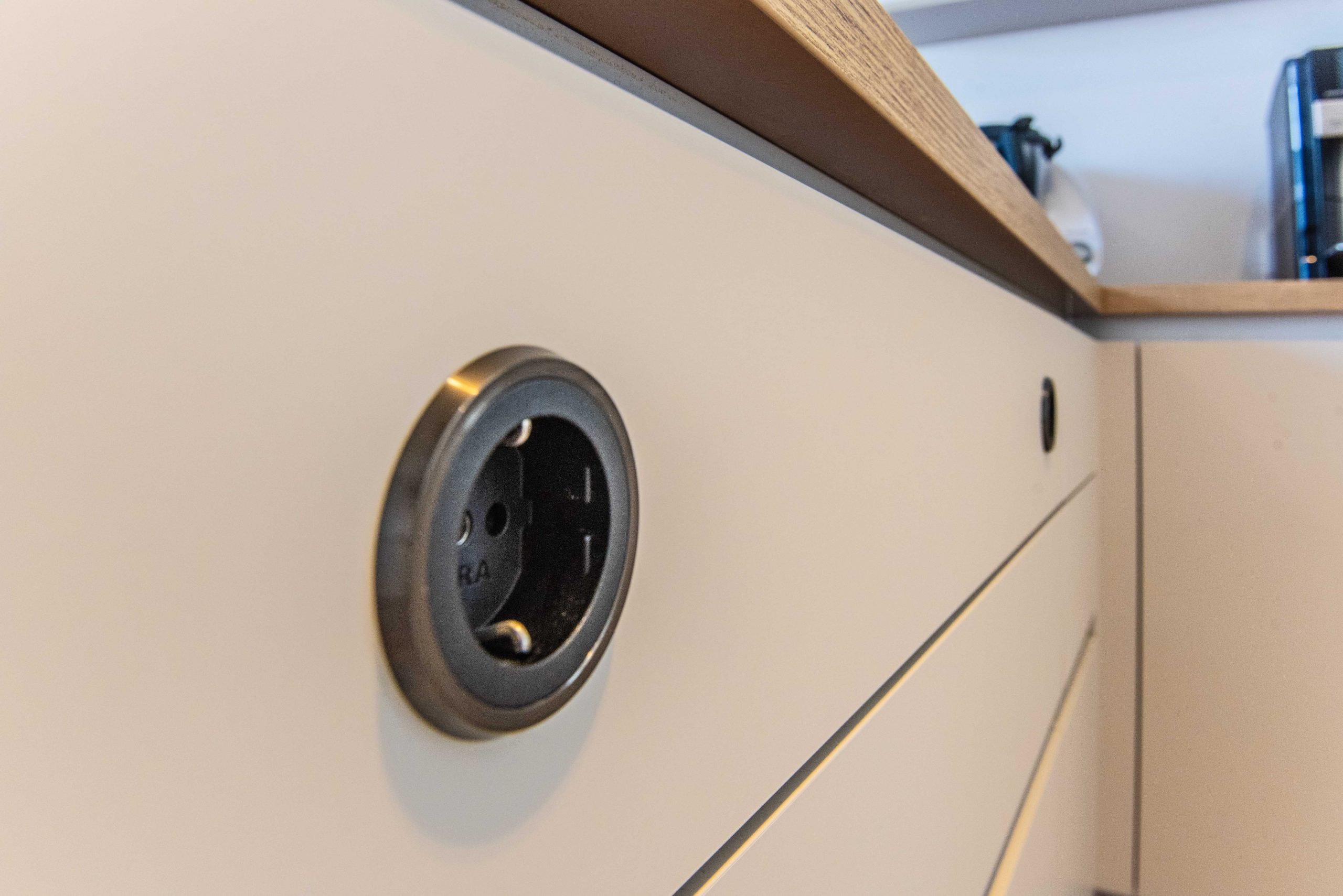 Ganz bewusst wurde auf Hängeschränke verzichtet. Das typische „Küchenflair“ fehlt diesem Raum komplett. An einem großen „Tisch“ mit Unterschränken finden sich Sitzgelegenheiten und die Kochplatte. Dank des BORA Kochfeldes konnte auf eine Dunstabzugshaube verzichtet werden. Geschirrspüler und Backofen bilden einen niedrigen „Hochschrank“. Gegenüber befinden sich zwei Hochschränke mit Kühl- und Gefrierschrank sowie einem Vorratsschrank. Der alte, kleine Küchenraum wurde zum Wohnraum aufgebrochen – jedoch nicht mit einem Durchgang, sondern einer großen Öffnung. In diese Öffnung hinein hat eine weitere Ablage- und Arbeitsfläche, sowie Unterschränke ihren Platz gefunden.