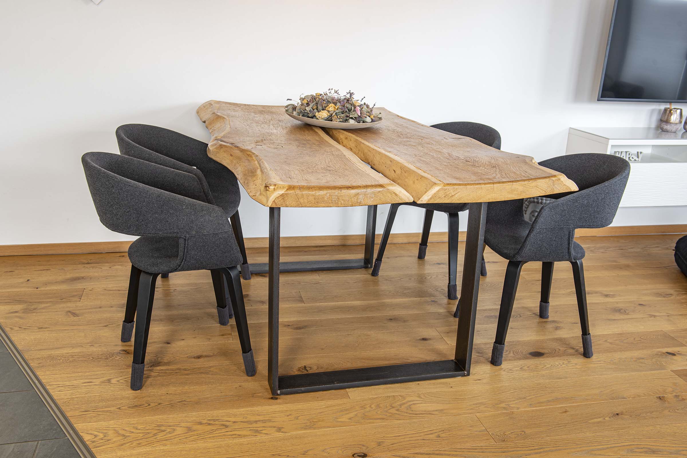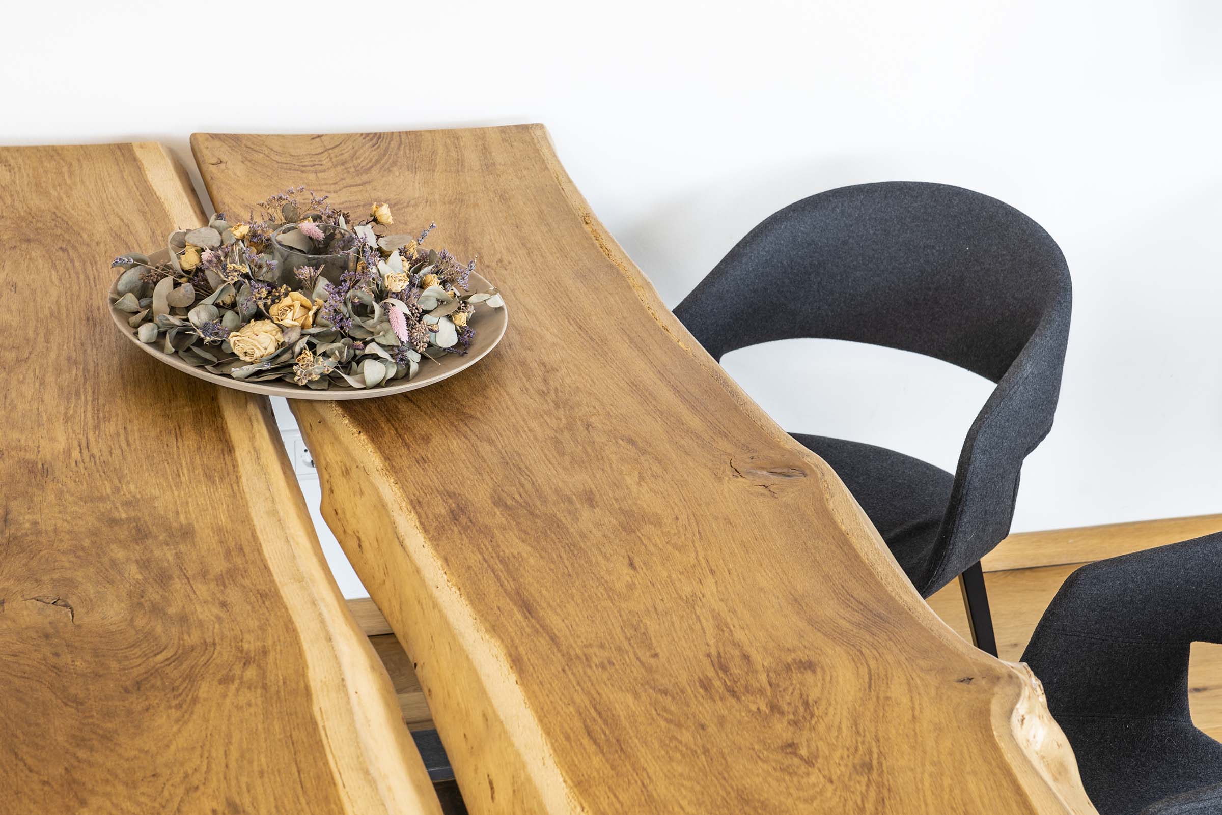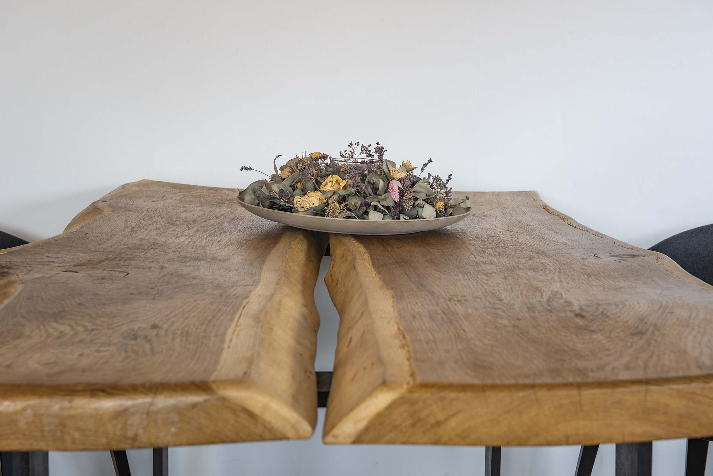 Ein Tisch mit natürlichem Rand: Dieser Esstisch ist in seiner Individualität nicht zu überbieten und dank der einzigartigen Maserung der Eichenbohlen ist dieser Tisch auch ein echter Hingucker in der Wohnung.