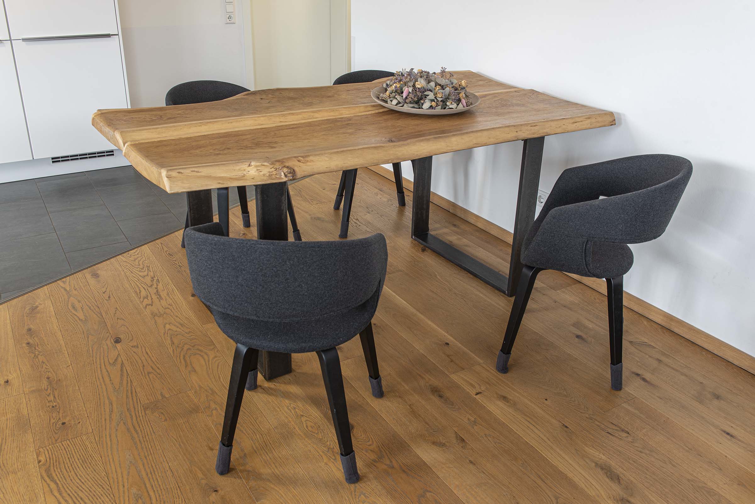 Für die neue Wohnungseinrichtung sollte neben einer Wohnküche mit klarer Linienführung ein Esszimmertisch entstehen, der sich der modernen Gestaltung anpasst und zugleich einen Kontrast darstellt. Passend zu den Holzböden und der Gesamtgestaltung der Wohnung wurde eine besondere Eichendiele ausgewählt: Die Holzbretter wurden über viele Jahre luftgetrocknet und weisen eine leichte Verformung auf, die in die Gestaltung des Esstisches einbezogen worden.