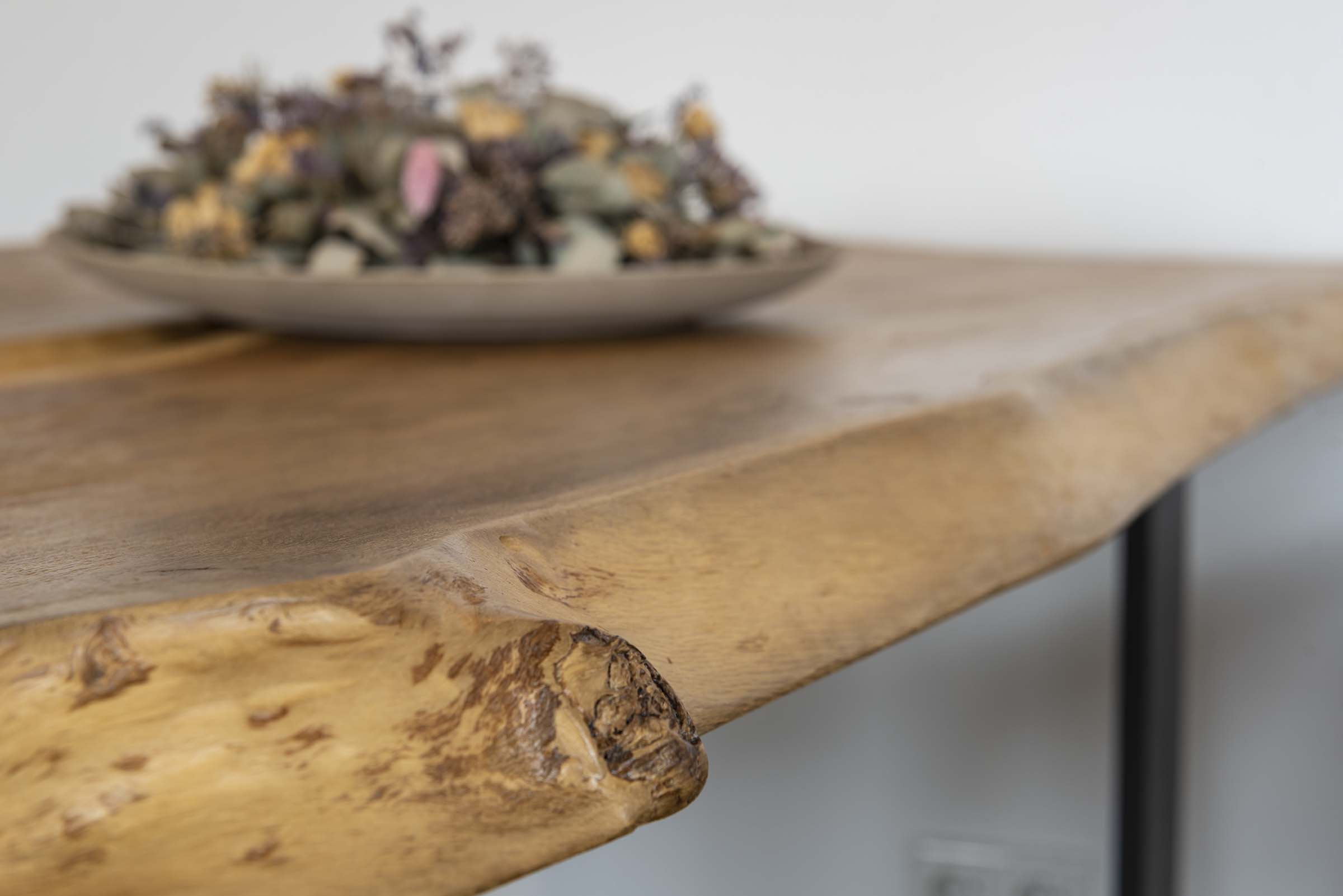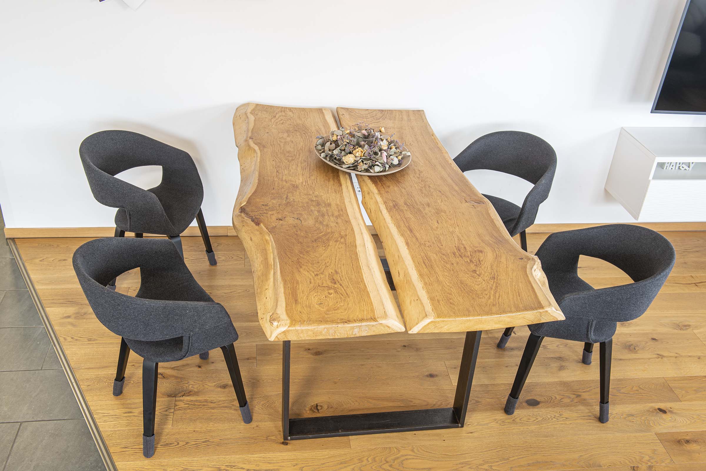 Entstanden ist ein Esstisch, dessen Ursprung deutlich zu erkennen ist: Der natürliche Rand (Borke) des Holzes ist erhalten geblieben und in die Gestaltung des Esszimmertisches eingeflossen. Das Tischgestell ist aus Stahl und in seiner Schlichtheit dem natürlichen Charakter des Tisches untergeordnet. Mit viel Liebe zum Detail ist die Natürlichkeit des Eicheholzes in echter Handarbeit in die Gestaltung dieses einzigartigen Möbelstückes eingeflossen.
