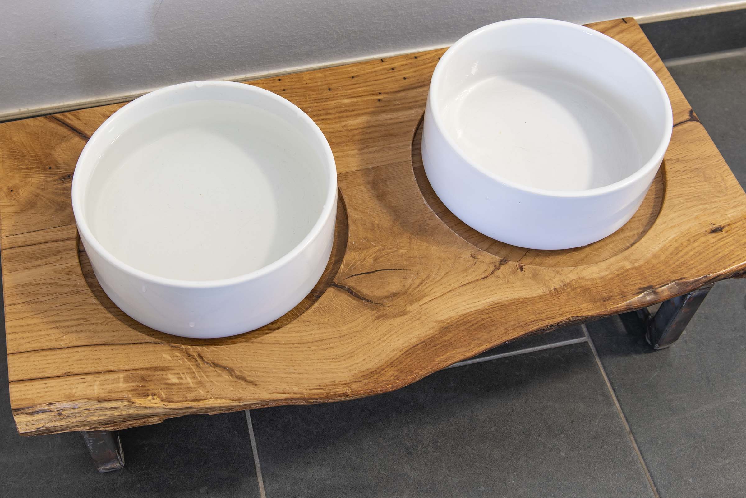 Die Eiche-Bohle für den Futtertisch ist handgefertigt und mit Klarlack vor Wasser geschützt. Die Futter- und Wasserstation hat darüber hinaus eine an die Hundegröße angepasste Höhe. Eine Futterbar, die Hund und Herrchen gleichermaßen Freude macht. Gerne fertige ich Ihnen eine Futterbar auch für Ihren liebsten Vierbeiner – passend zu Ihrer Einrichtung. Eine absolut individuelle Futterbar nach Ihren Wünschen!