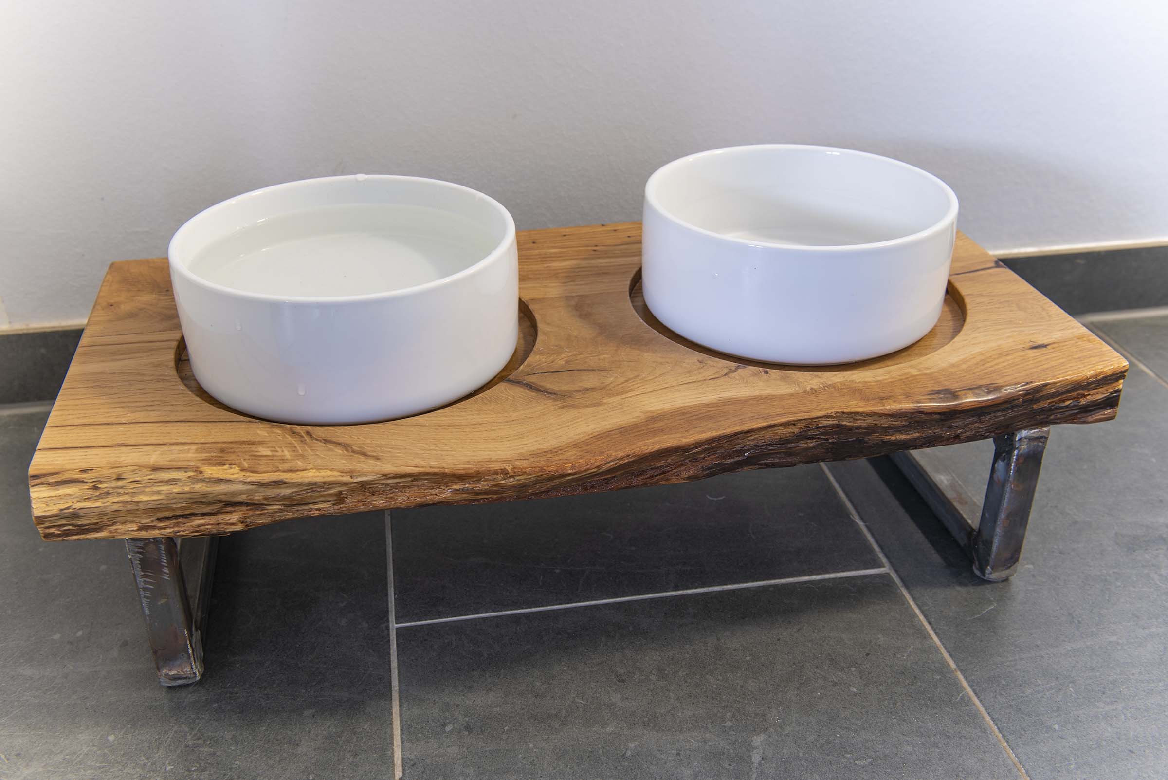 Eine Futterbar für Ihren Hund, die zu Ihrer Einrichtung passt. Aus einer Eiche-Bohle ist dieser besondere Futternapf-Tisch entstanden. Passend zu der Wohnungseinrichtung hat auch „Happy“ einen besonderen Futterplatz. Zwei weiße Näpfe für Wasser und Hundefutter sind in die Eiche-Vollholzbohle mit Borke eingelassen. Der Futtertisch fußt auf zwei Stahlfüßen im Industrial Style.