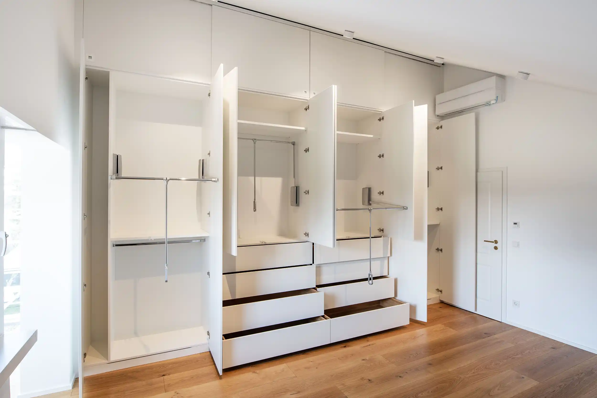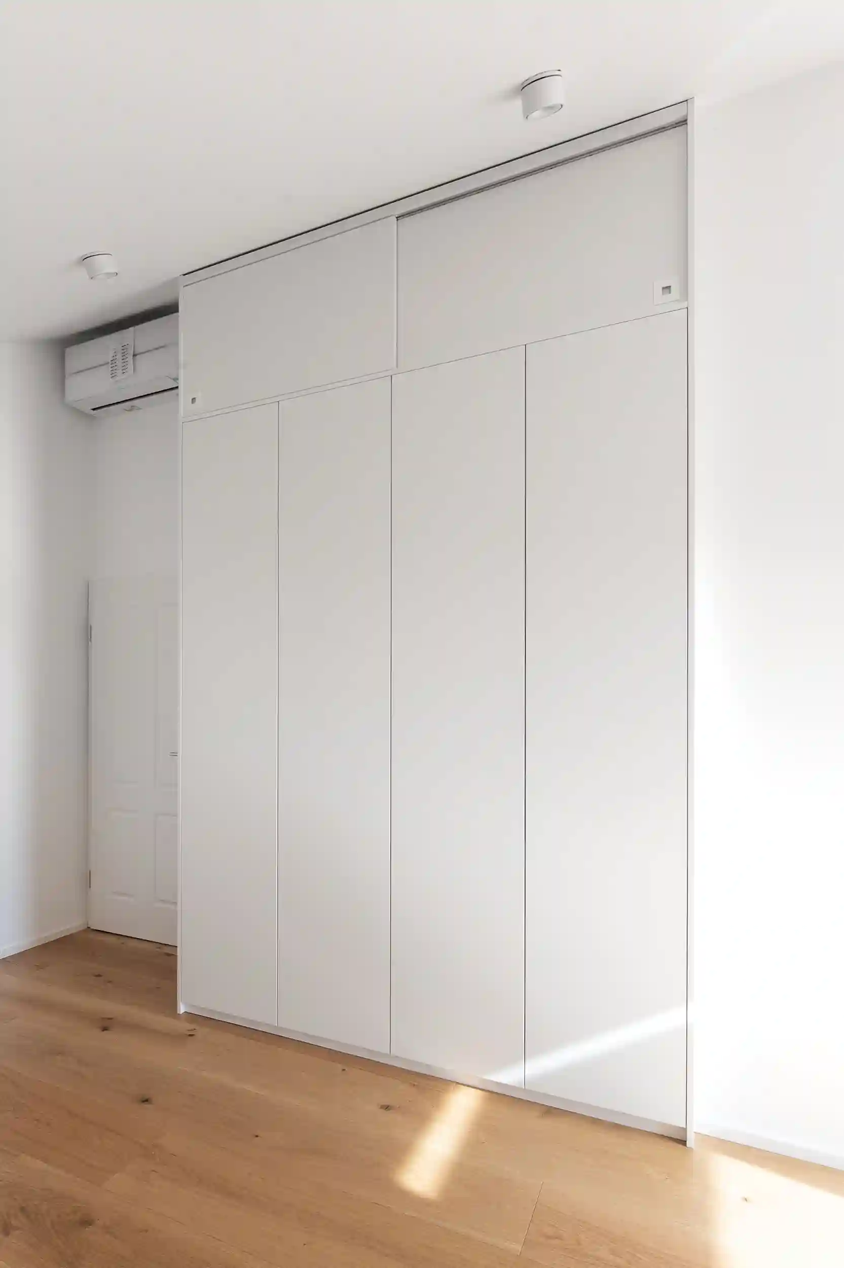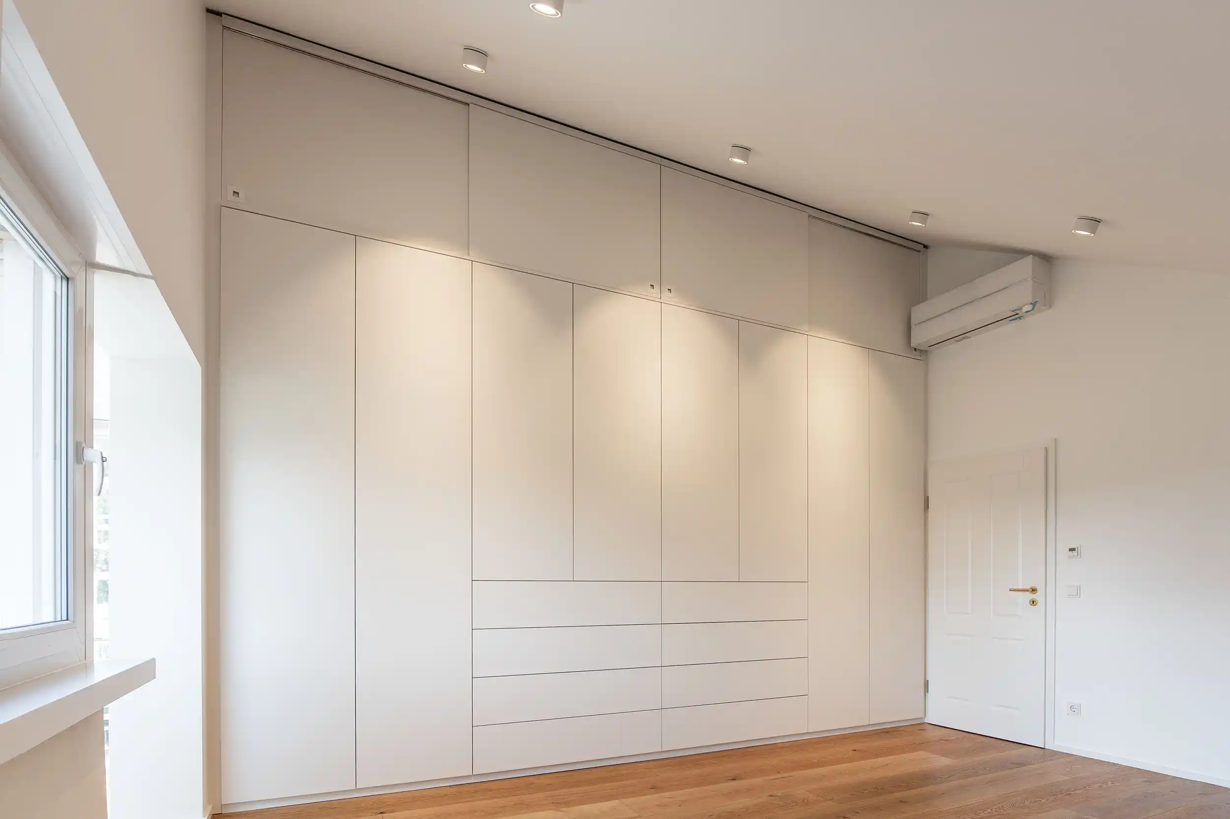 Auch im kleineren Giebelzimmer stand die maximale Ausnutzung der Raumhöhe im Fokus. Bei einer Breite von ca. 2,50 Metern und einer beeindruckenden Höhe von fast 4 Metern haben wir ein Möbelstück entworfen, das die vertikale Linie des Raumes betont, ohne ihn zu erdrücken. Um ein ruhiges und unaufgeregtes Gesamtbild zu schaffen, planten wir die Fronten mit einer strengen Symmetrie. Vier raumhohe Flügeltüren mit moderner Push-to-open-Technik verzichten komplett auf Griffe und lassen den Schrank wie eine homogene Wandfläche wirken. Eine besondere konstruktive Herausforderung war auch hier der oberste Giebelbereich: Da Flügeltüren beim Öffnen mit der Dachneigung kollidiert wären, haben wir diesen Bereich mit dezenten Schiebetüren ausgestattet. So bleibt der Stauraum bis unter den First voll nutzbar, während das Design eine klare, minimalistische Sprache spricht, die den Raum optisch weitet.