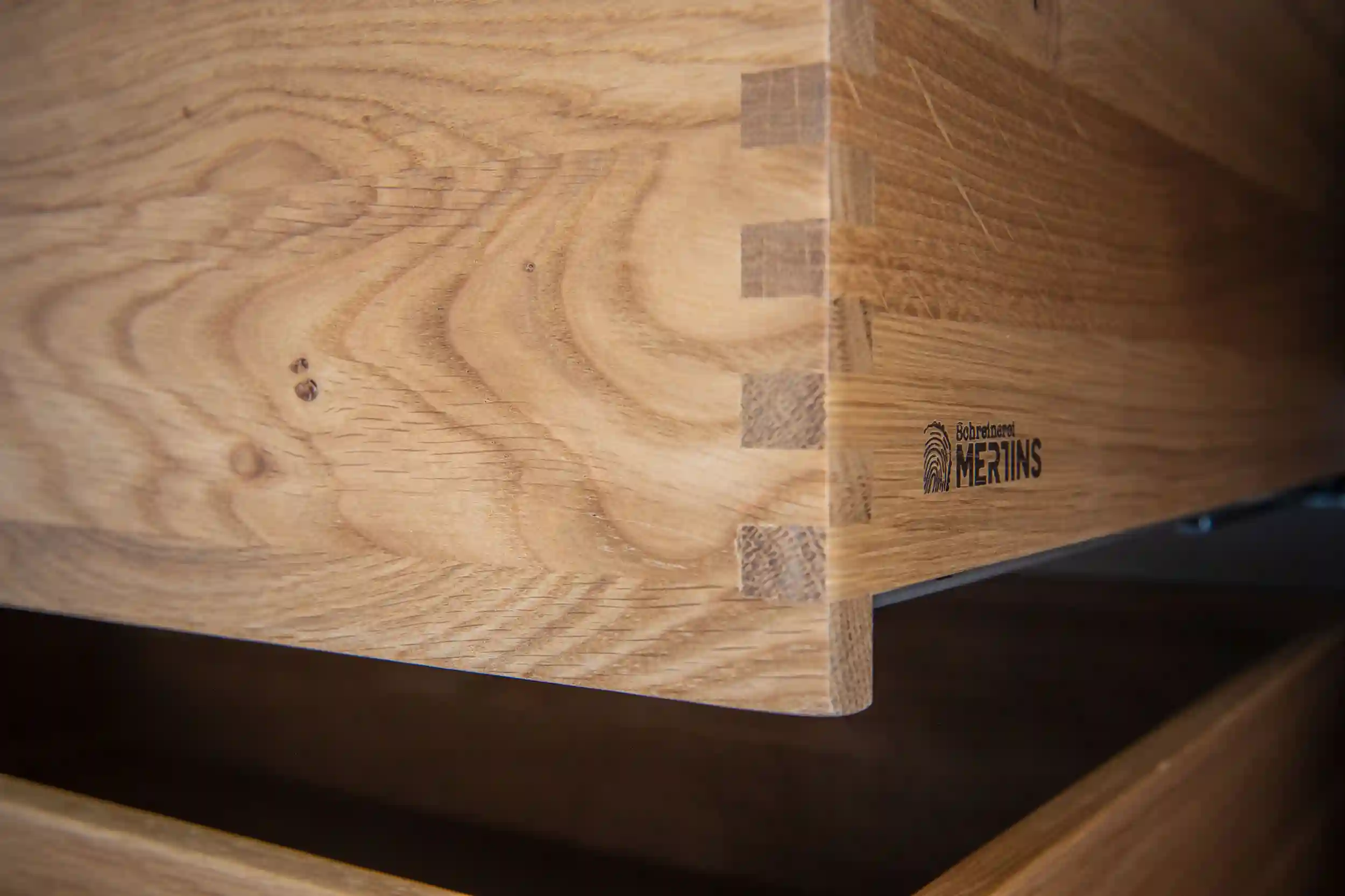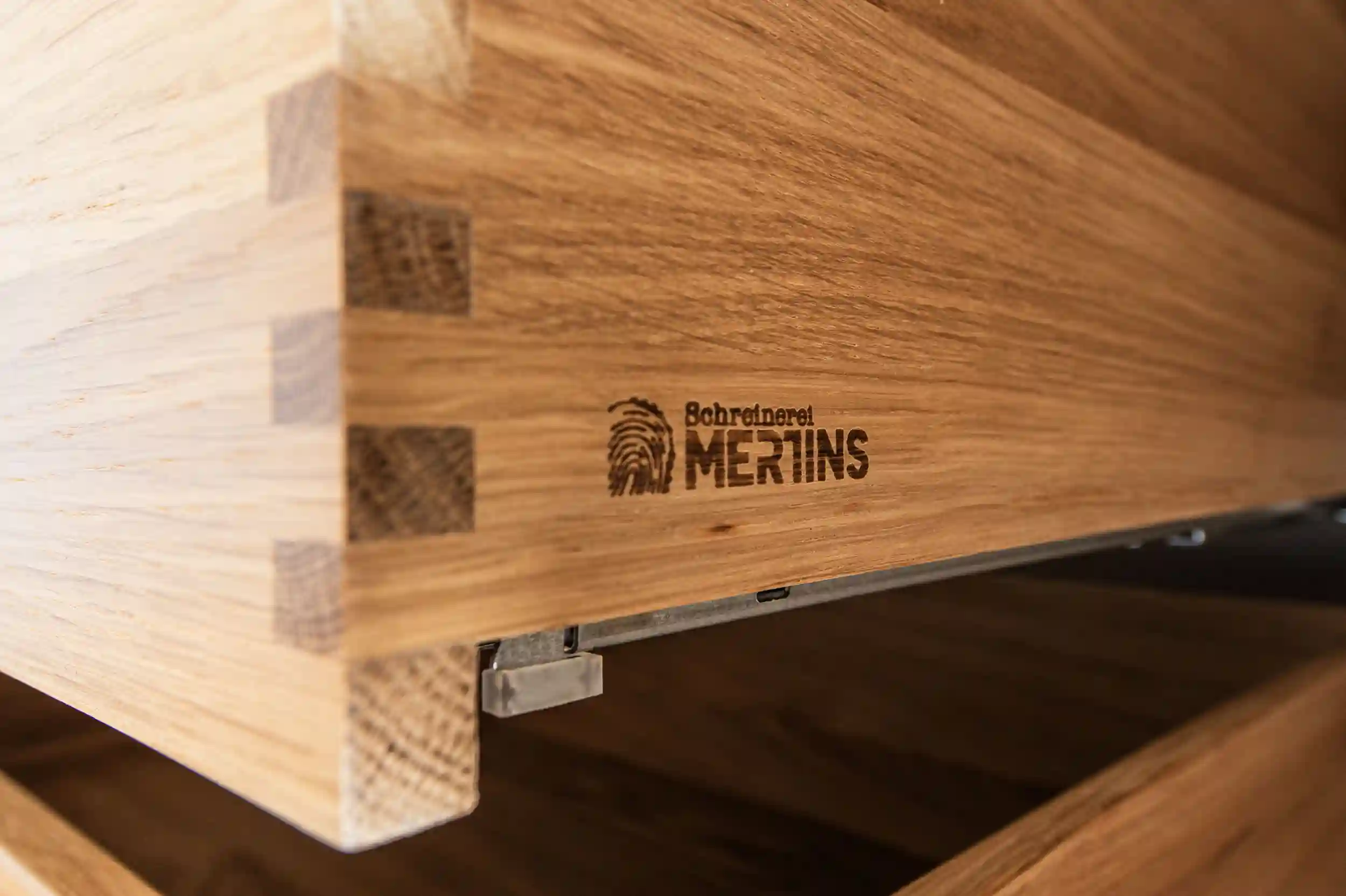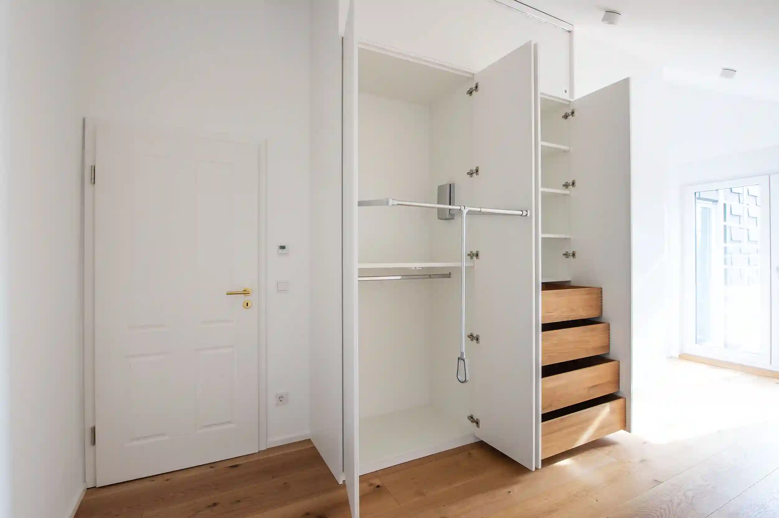 Die handwerkliche Umsetzung dieses Projekts vereint modernste Beschlagtechnik mit klassischem Schreinerhandwerk. Trotz der kompakteren Breite bietet das Innenleben luxuriösen Komfort: Herzstück sind vier fingergezinkte Schubladen aus massiver Eiche, die wir in unserer Werkstatt mit höchster Präzision gefertigt haben. Um die enorme Höhe von 4 Metern alltagstauglich zu machen, wurde ein leistungsstarker Kleiderlift mit einer Traglast von 20 kg fachmännisch montiert. Dieser ermöglicht es, die obere Kleiderstange mühelos auf Griffhöhe herabzuschwenken. Ergänzt durch vier flexible Regalböden und eine feste Kleiderstange bietet der Schrank eine perfekt organisierte Innenaufteilung. Die Montage im schmalen Giebelzimmer erforderte höchste Sorgfalt, um die filigranen Passungen an die Dachschräge millimetergenau zu realisieren. Das Ergebnis ist ein Meisterstück der Platzersparnis, das durch die Materialkombination aus kühler Front und warmem Eichenholz im Inneren besticht.