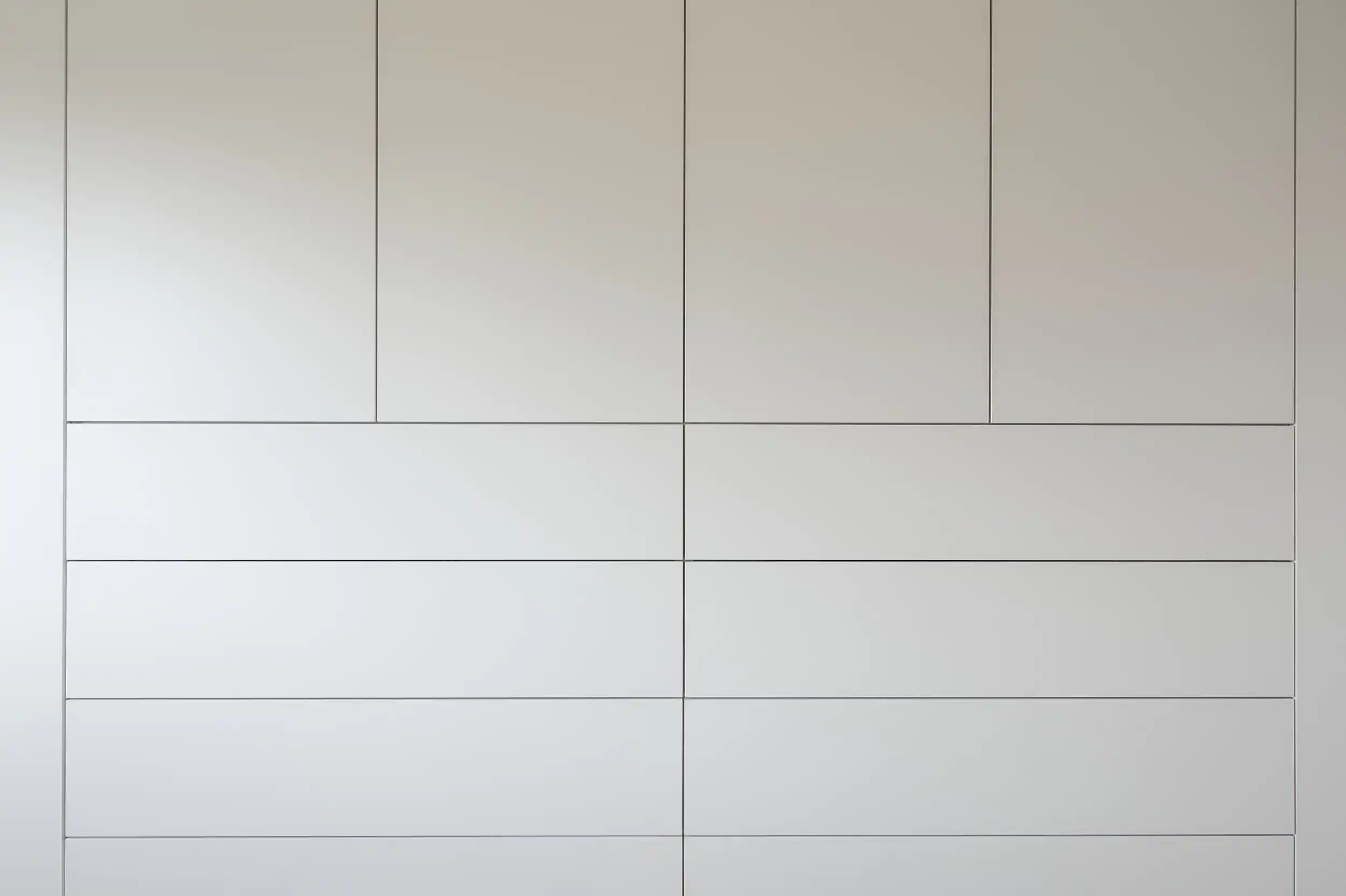 Die größte Herausforderung bei der Planung dieses monumentalen Einbauschranks lag in der extremen Firsthöhe und der steilen Dachschräge. In enger Abstimmung mit dem Kunden haben wir ein Konzept entwickelt, das maximale Lagerfläche schafft, ohne den Raum optisch zu erdrücken. Ein besonderes Augenmerk lag auf der mechanischen Funktionalität: Da klassische Flügeltüren im oberen Bereich aufgrund der Dachneigung beim Öffnen an die Decke gestoßen wären, haben wir uns dort für ein elegantes Schiebetür-System entschieden. Diese gleiten lautlos zur Seite und geben den Weg zu den obersten Staufächern frei, ohne Platz im Raum zu beanspruchen. So konnten wir die streng symmetrische Optik der Fronten beibehalten und gleichzeitig eine barrierefreie Nutzung der gesamten Schrankhöhe garantieren. Jedes Element wurde dabei individuell auf die baulichen Gegebenheiten des Dachgeschosses zugeschnitten, um eine lückenlose Integration zu gewährleisten.