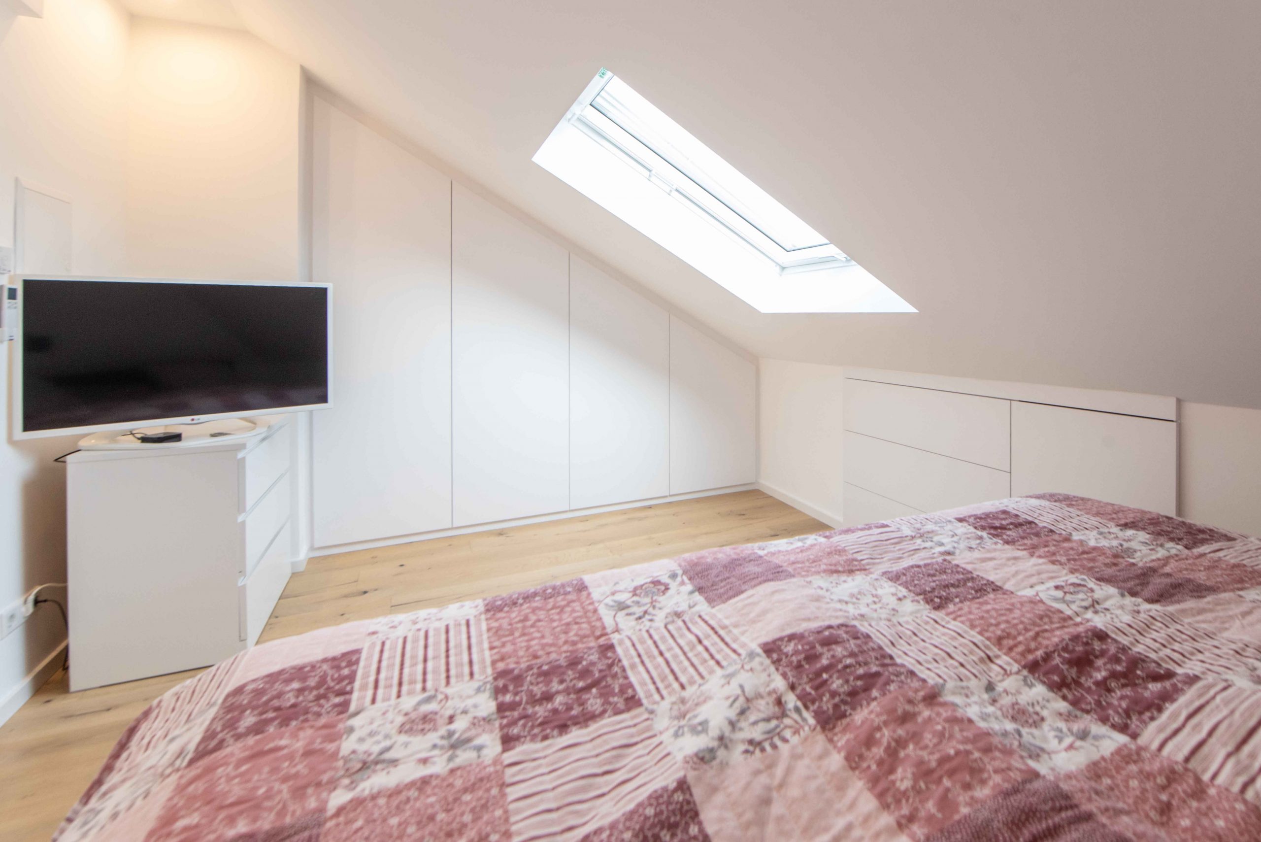 Die individuell angefertigten Schränke in den Dachschrägen sind die perfekte Lösung, um den Raum effizient zu organisieren und gleichzeitig den ästhetischen Wert des Schlafzimmers zu erhöhen. Diese maßgeschneiderten Einbaumöbel fügen sich nahtlos in die Konturen Ihres Dachgeschosses ein und bieten maximalen Stauraum für Kleidung, Bettwäsche und andere persönliche Gegenstände.
